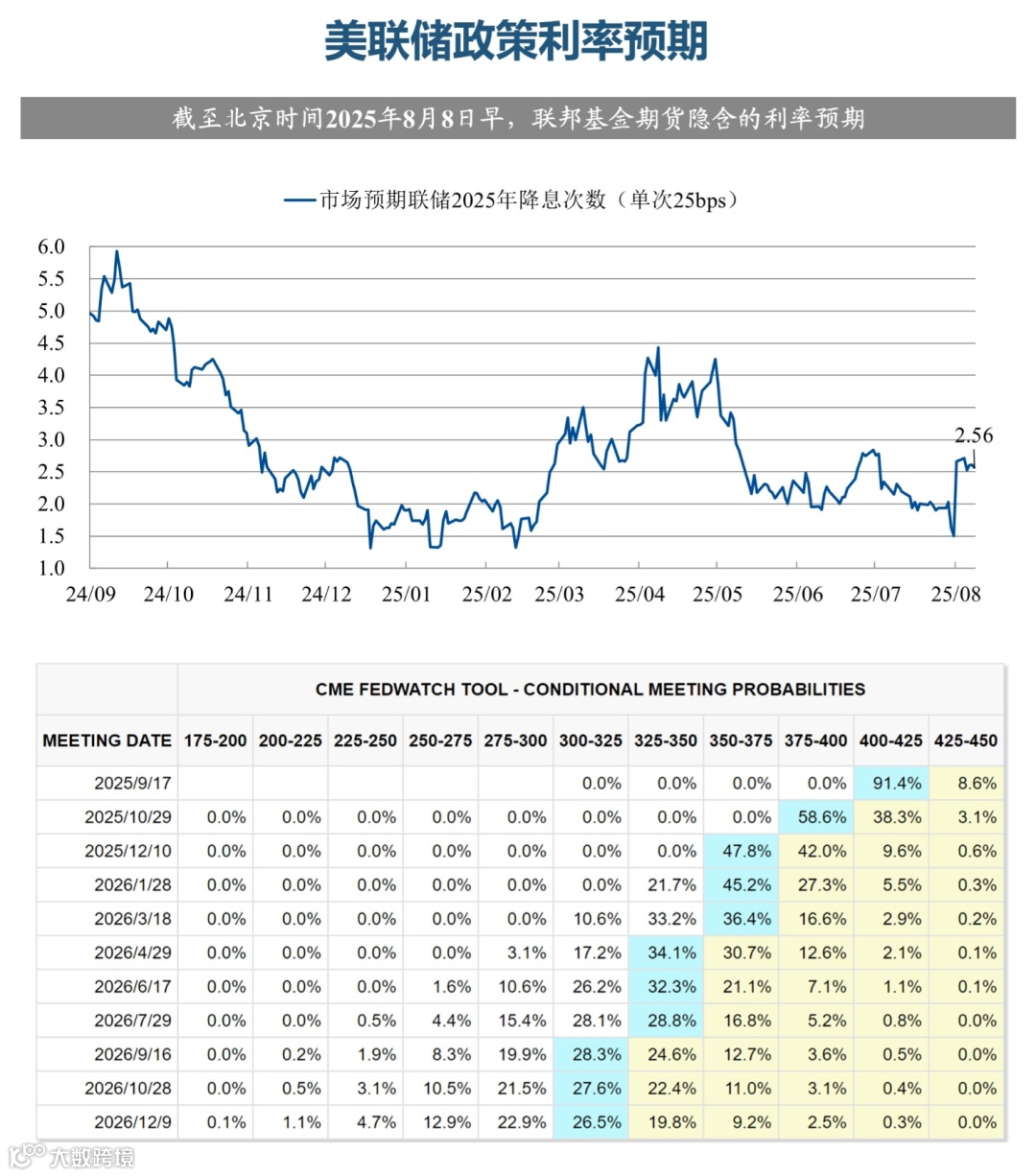 当前市场预期美联储年内降息2.56次,9月降息的预期较为充分,CME预测降息概率为91.4%。