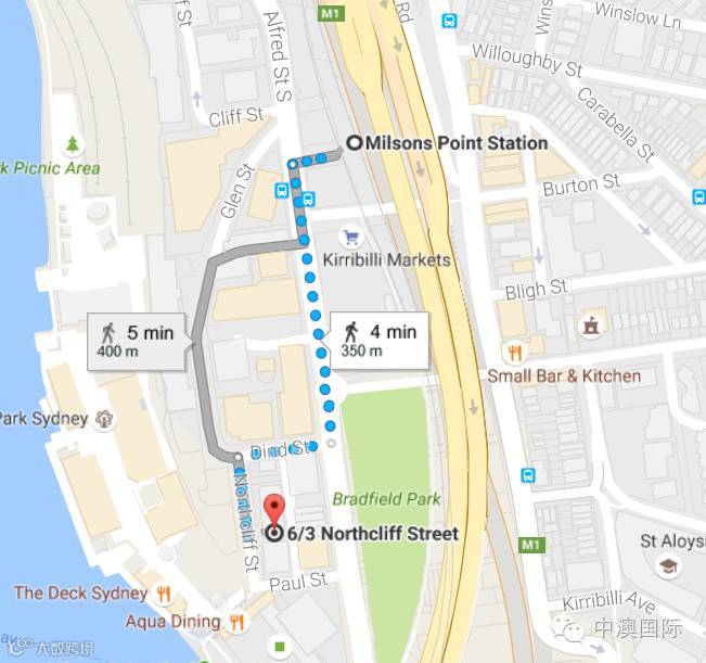 该房距离Milsons Point Station 仅 350米, 5分钟内就可以步行到达。