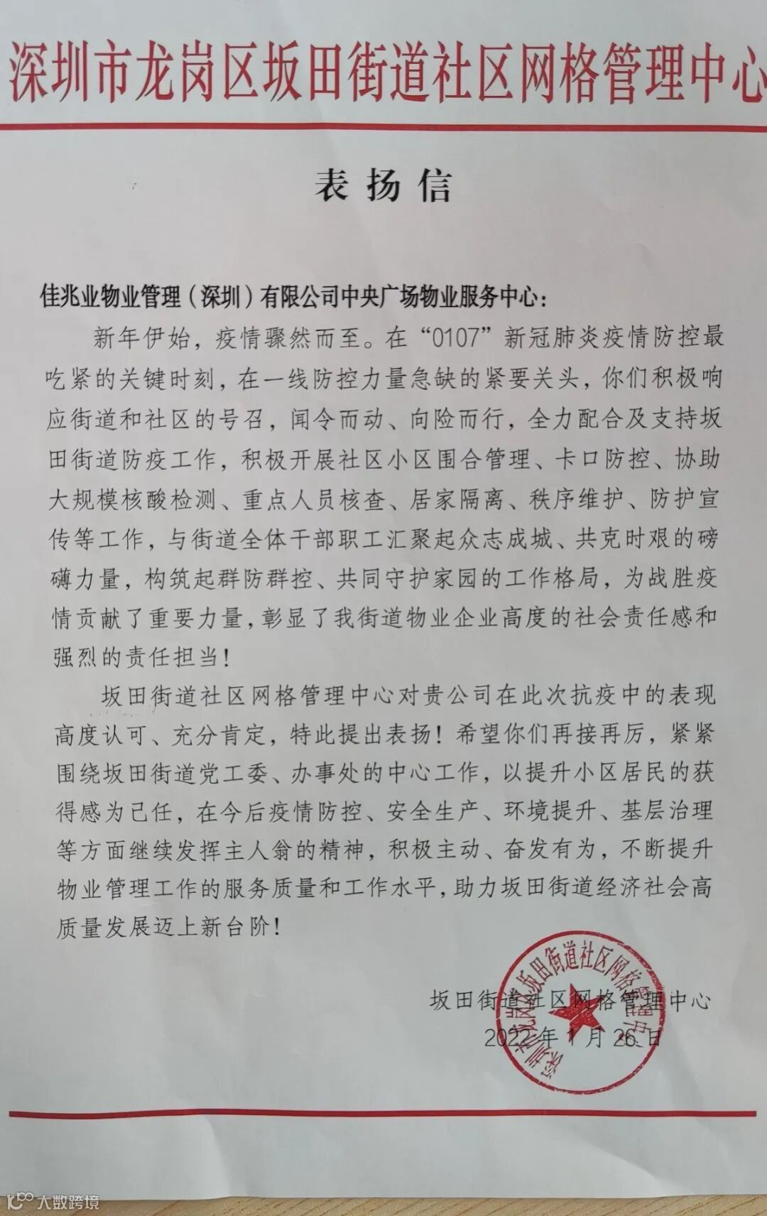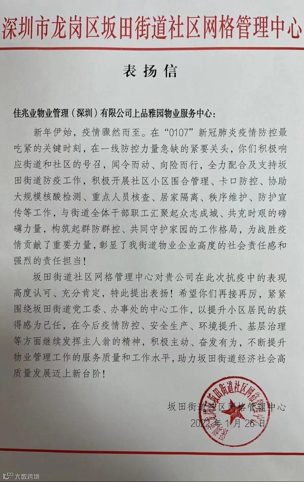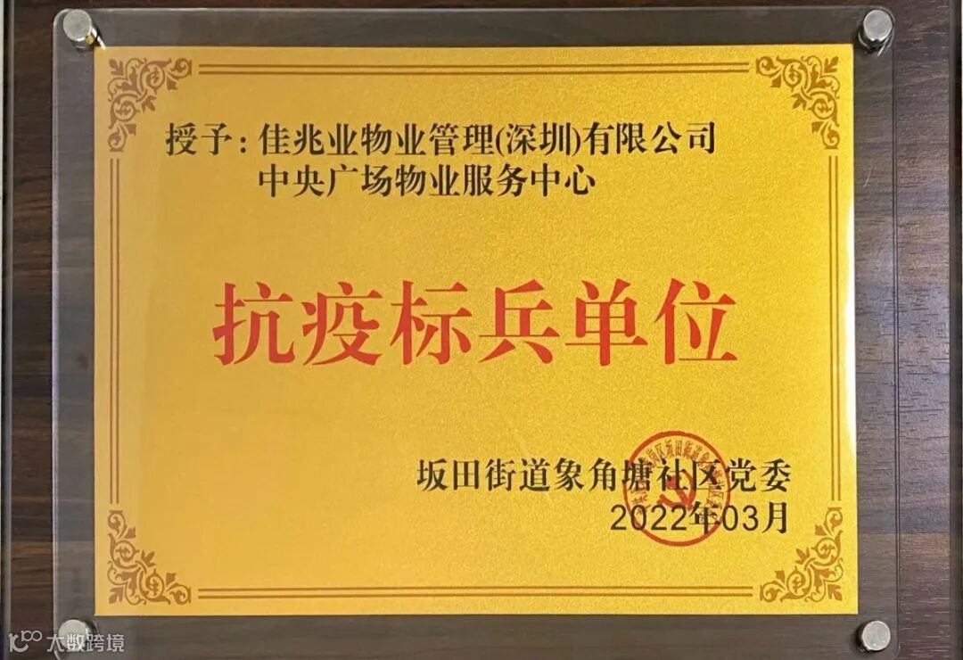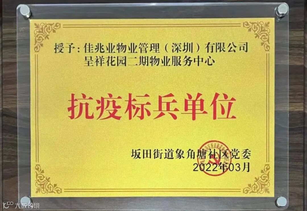 近日,在龙岗坂田街道象角塘疫情防控工作表彰会议上,佳兆业美好深圳分公司中央广场、呈祥花园二期项目被授予“抗疫标兵单位”荣誉称号,疫情防控工作获充分肯定与赞扬。