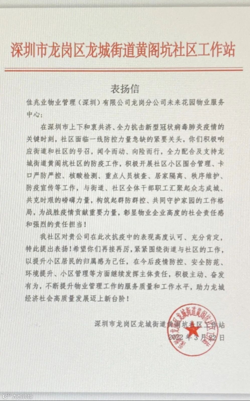 2022年一季度以来,在深圳市疫情防控大考面前,深圳分公司各项目在政府有关部门的指导下严格按照相关要求有序部署并执行防疫工作,从严从紧筑牢疫情防控安全屏障,认真落实落细各项防疫措施,坚持科学防疫、严格管理、暖心服务,先后收获来自政府相关部门的表彰与感谢、业主的认可与鼓励。