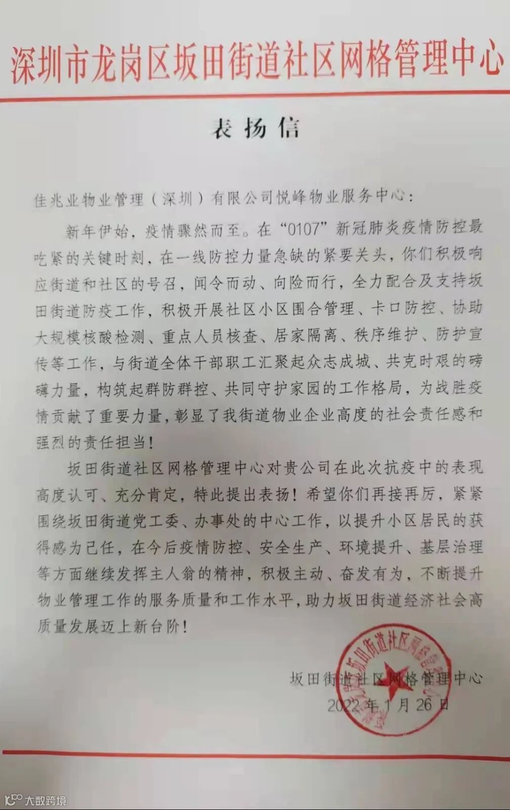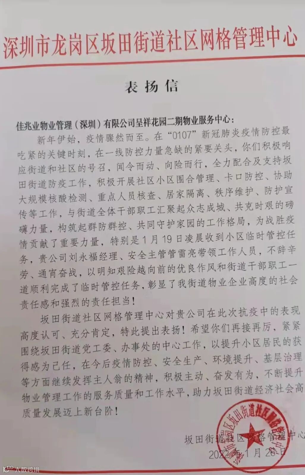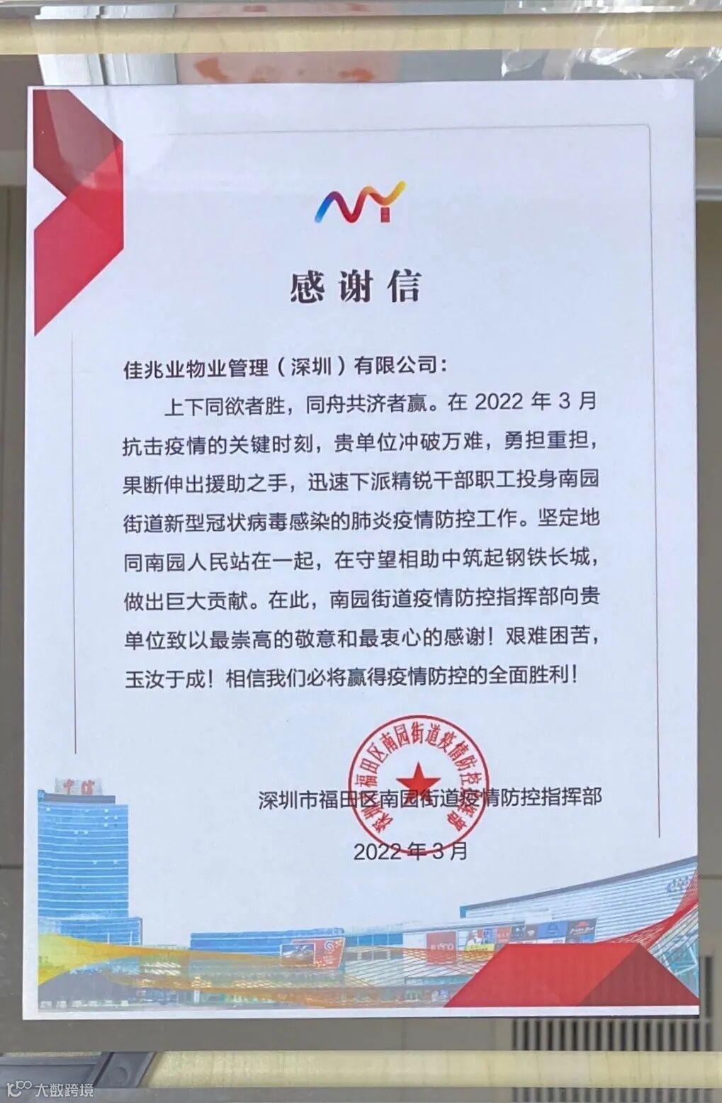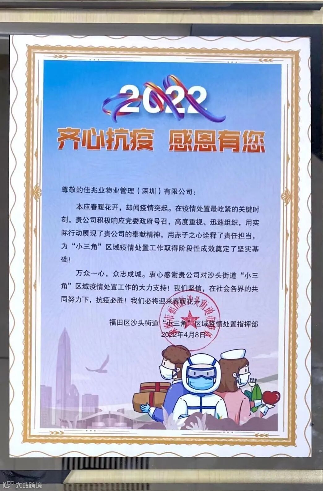 收获政府部门、业主等相关单位的感谢与认可,佳兆业美好深圳分公司全体上下与有荣焉。阶段性的荣誉是对过往工作的肯定,对未来的工作而言,更是强有力的鞭策。在今后,深圳分公司也将始终担当作为,再接再厉,毫不松懈地做好常态疫情防控工作。