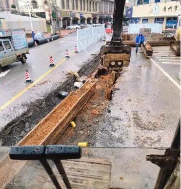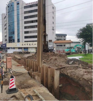 桩机及钢板桩均转移完毕后,机长有条不絮的开展工作,把6m桩压入沟槽基坑中,雨水伴随桩身落入土中。
