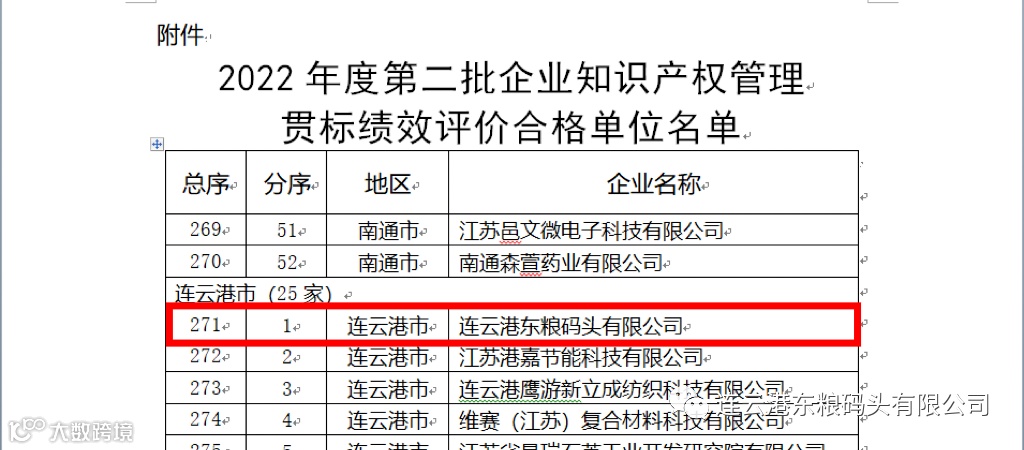 年度江苏省第二批企业知识产权管理贯标绩效评价合格单位名单,东粮公司荣登此列。