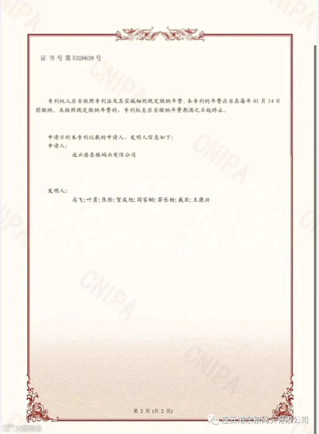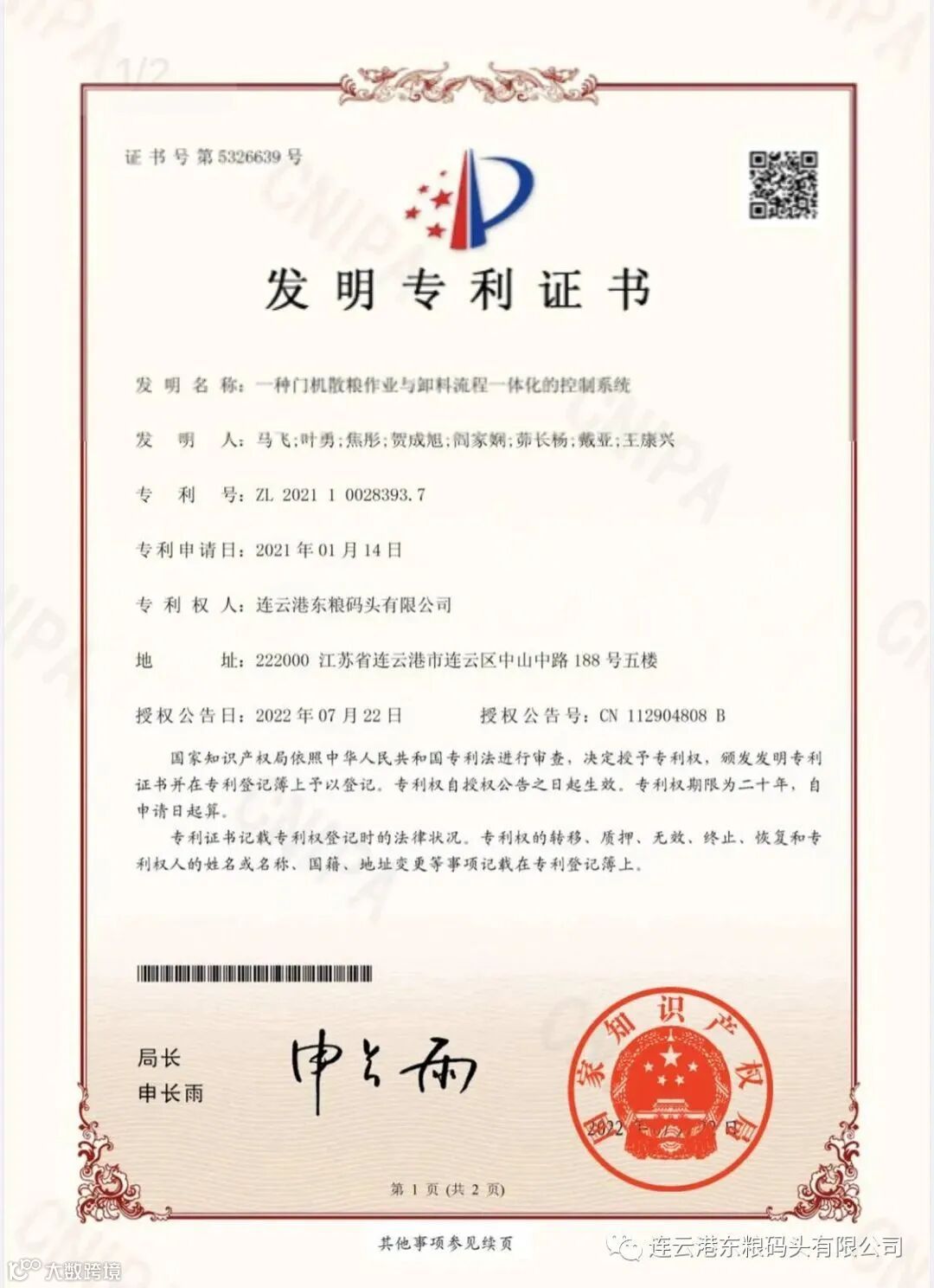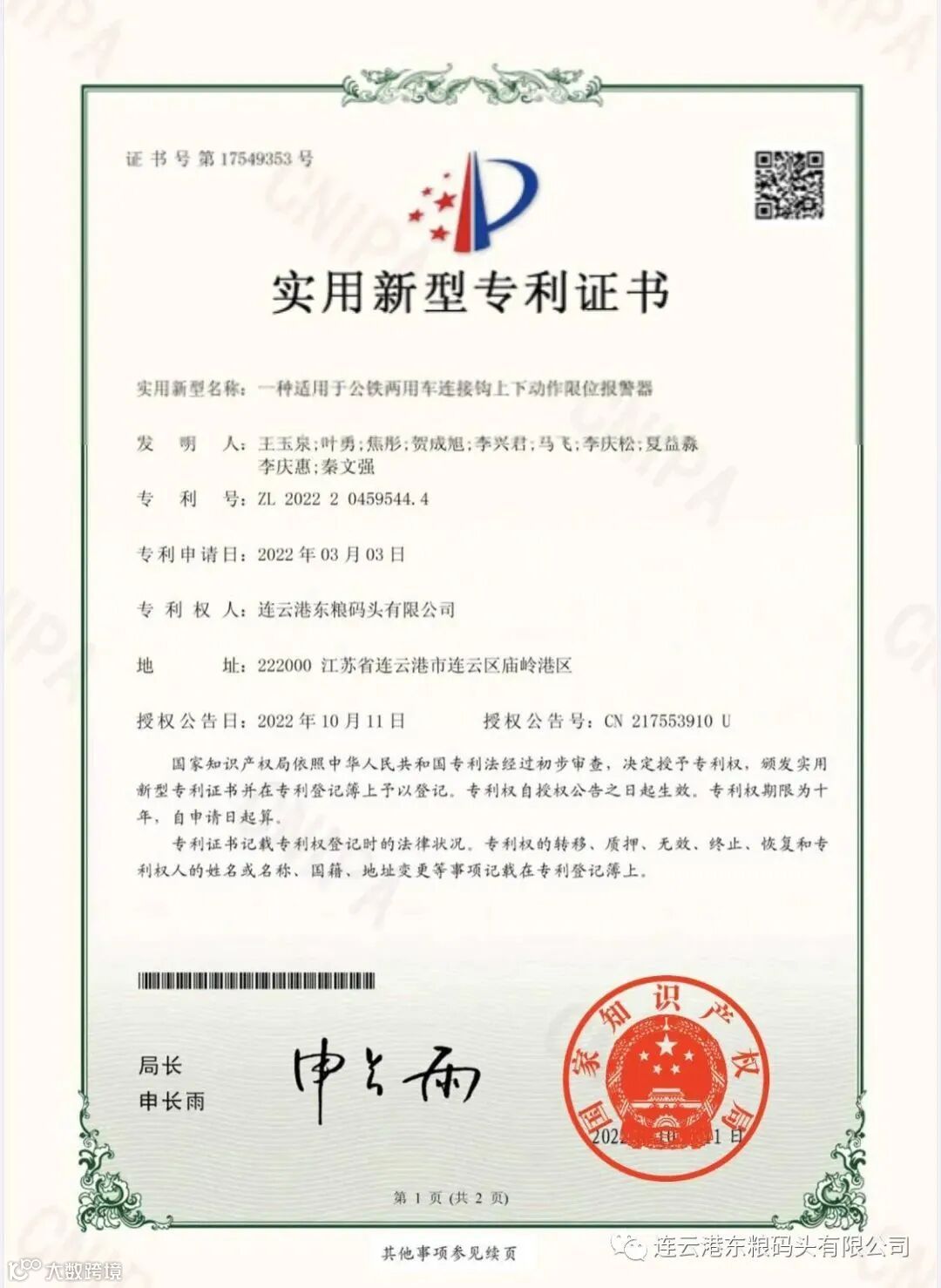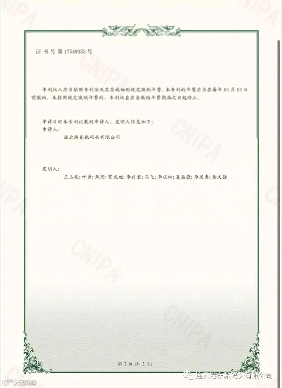 东粮码头有限公司申报的“基于激光测距技术的散粮装火车智能化系统”等三个获得国家发明