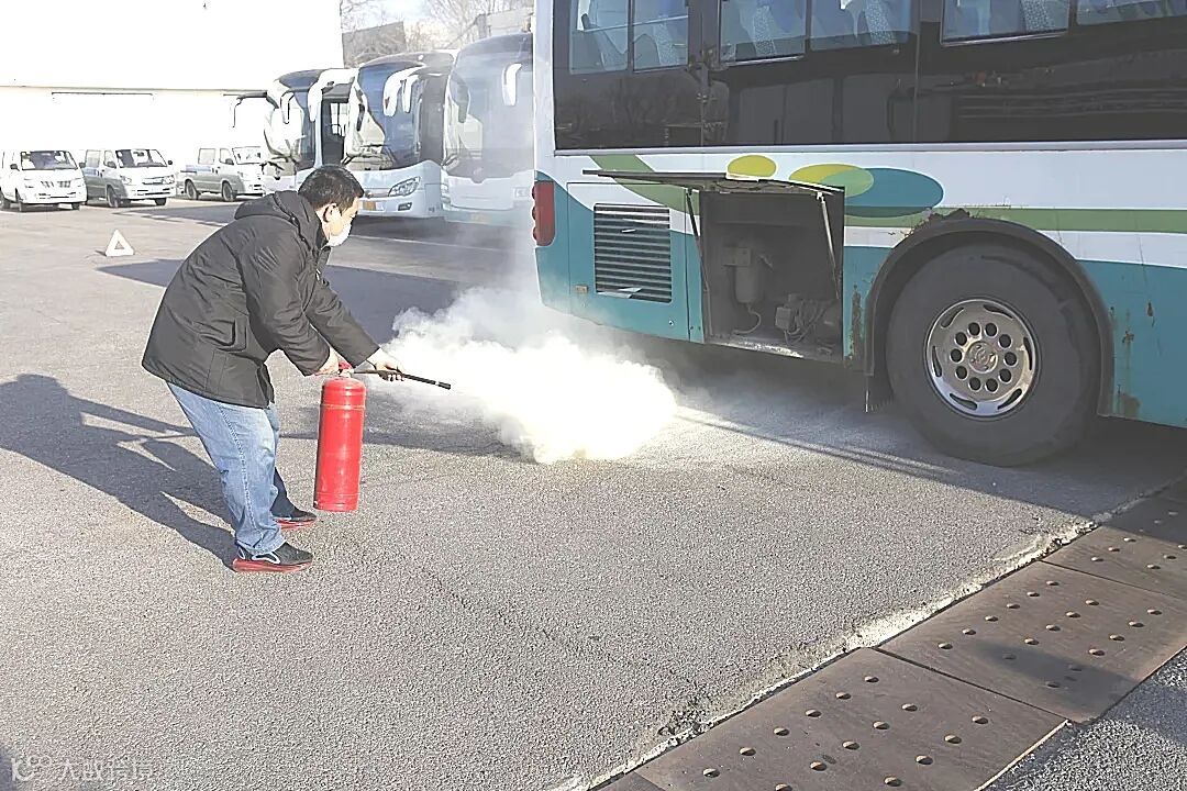 演练场景是一辆正在行驶的通勤客车尾部突然起火,驾驶员发现火情后迅速停车,打开车门组织乘车员工从车门逃生。后排乘客用安全锤的尖部敲打玻璃四角从侧窗、顶窗逃生。驾驶员迅速取出车上灭火器灭火,并向运输公司汇报。驾驶员拨打火警119和120急救电话,说明位置等待救援,指引并配合消防队员到达起火地点扑灭火险。