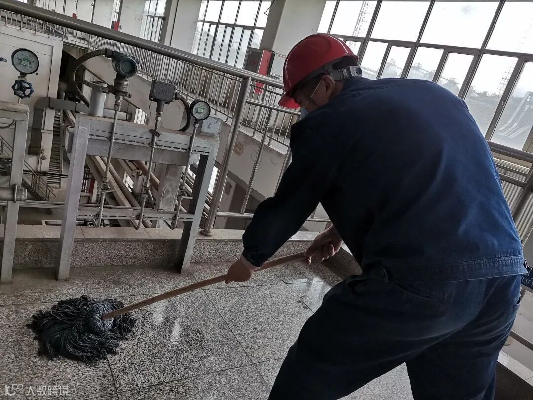 4月21日,一场突如其来的沙尘暴天气,给地面盖上一层薄薄细沙,该车间岗位员工不等不靠,立即将地面打扫干净。