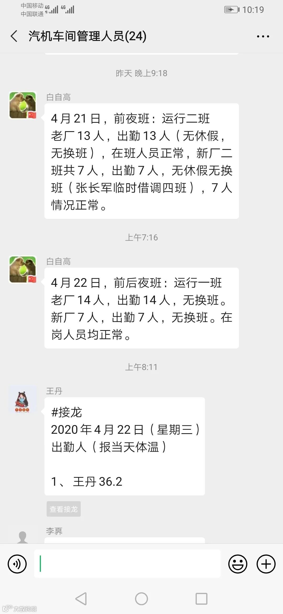 该车间每一名值班人员,负责将在岗的每一名员工的情况如实发送到管理群内,便于车间管理人员随时掌握在岗员工的健康情况。