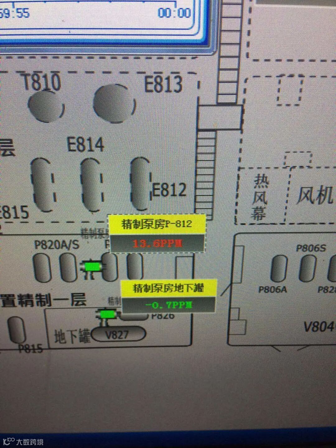 经过一个多小时的仔细排查,发现V-829放空管线法兰垫片处有气体挥发,经手持式HCN报警仪检测后发现问题。