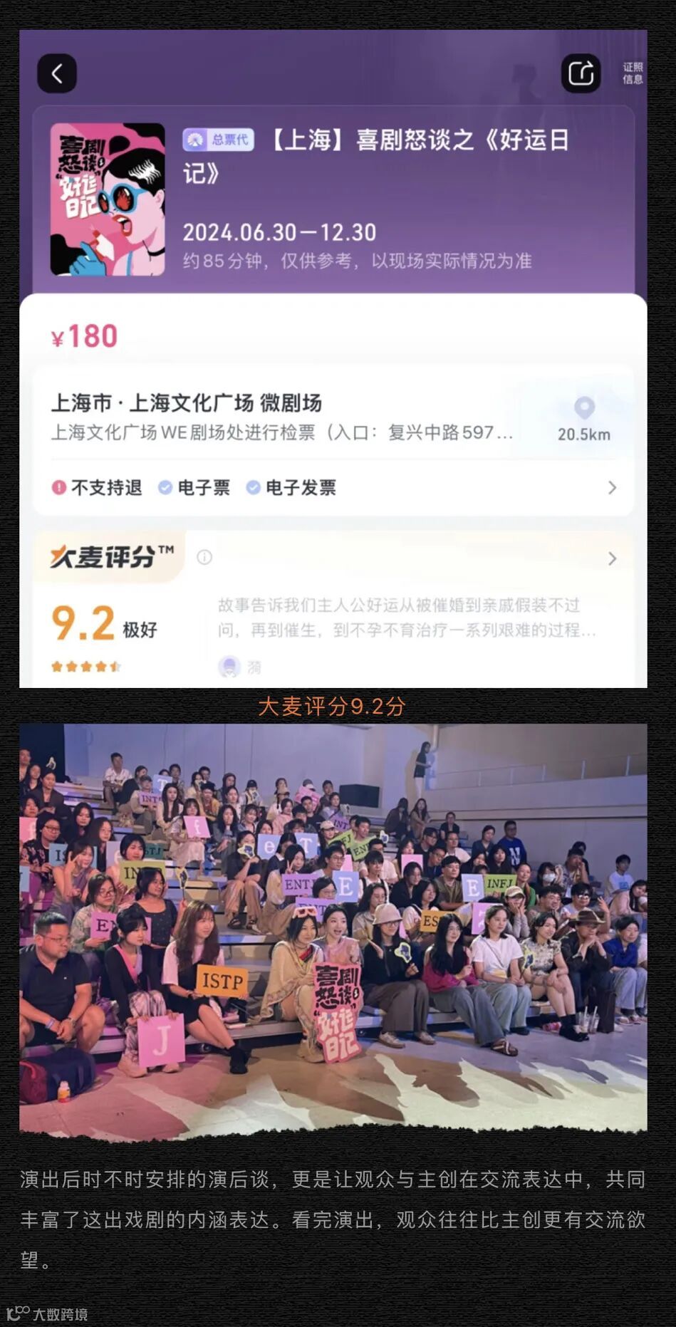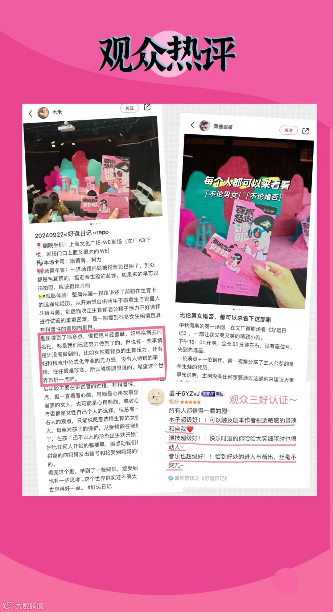 这部由零纪演艺出品、与倡导“悦己”理念的大人糖产生奇妙共振的作品《好运日记》,女主角郝韵通过一人分饰N角的形式,用85分钟沉浸式剧场脱口秀,揭开了一个在东亚文化中被精心保护起来的禁忌话题——生育。全程笑点密集,情节丝滑,走心又催泪。