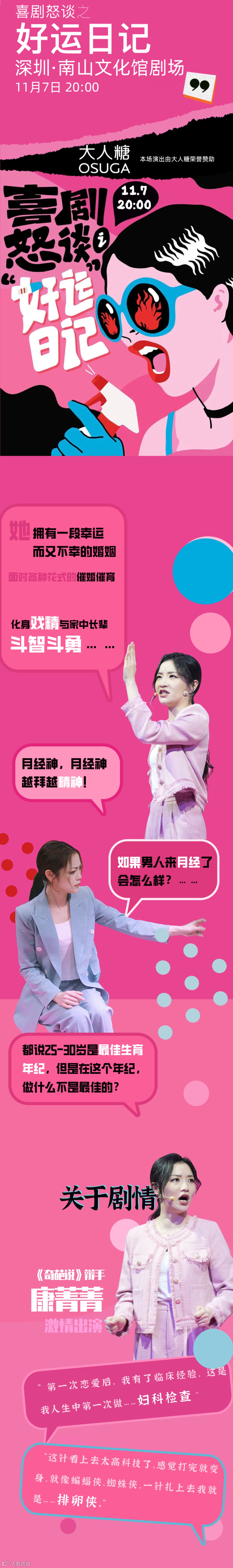 2025年11月7日,《好运日记》将在深圳南山文化馆迎来新一轮演出。在这个充斥着标准答案的时代,给自己两小时走进剧场,体验一场由大人糖特别支持的、笑泪交织的心灵SPA,开启属于你的“阅己·越己·悦己” 觉醒时刻。