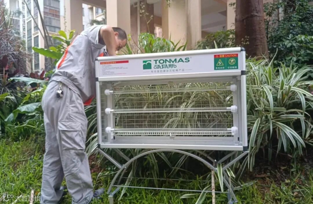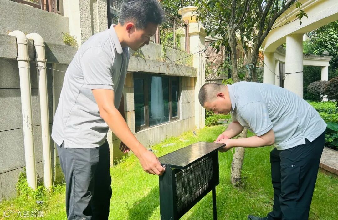 除了环境整治和全面消杀,各项目还在小区内安装了一系列先进的防蚊设施。太阳能灭蚊灯利用太阳能发电,环保又高效,能够吸引并消灭蚊虫。