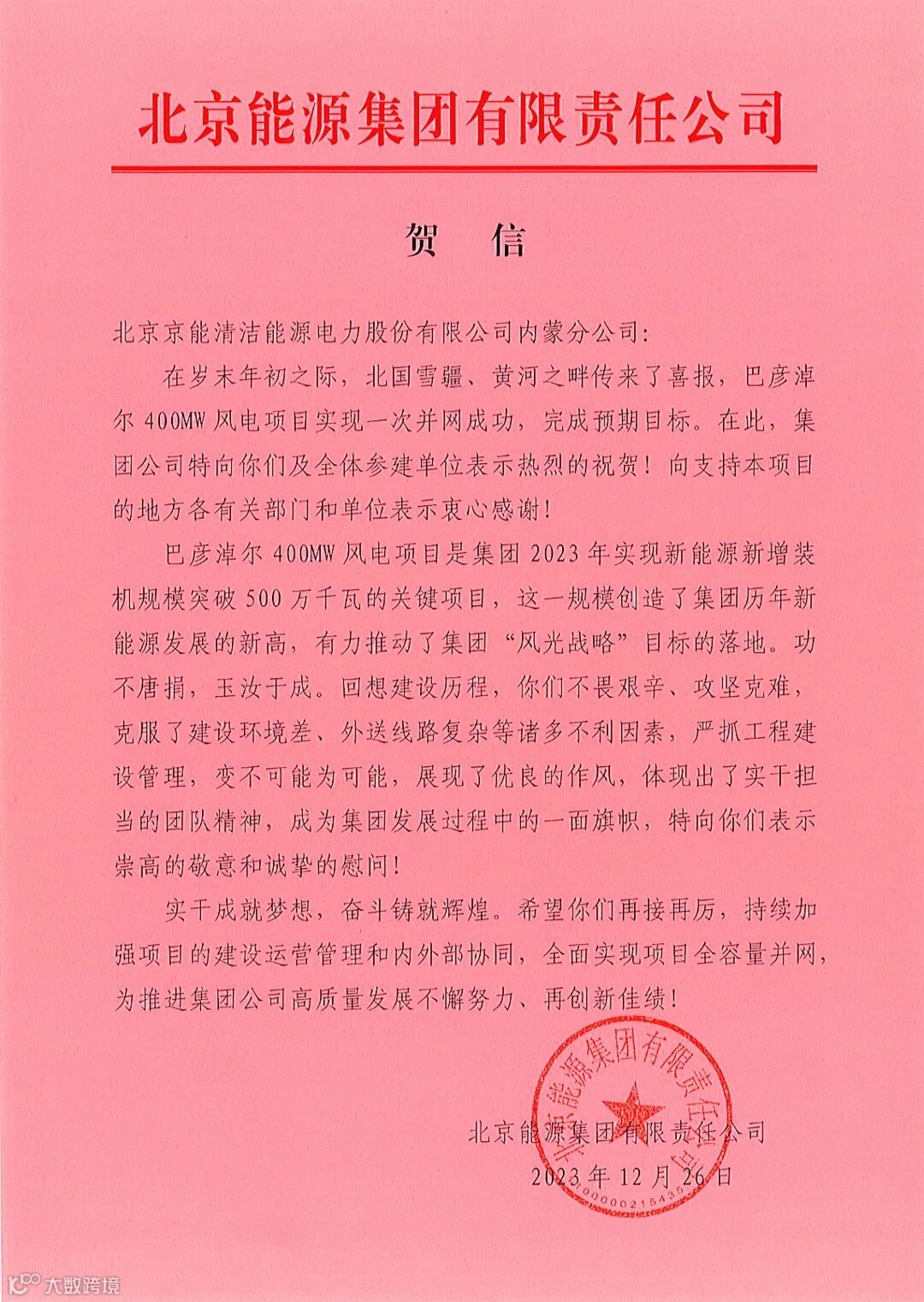 值此京能胡杨风储电站并网发电的关键时刻,集团发来贺信,向项目投产表示热烈祝贺和诚挚慰问!