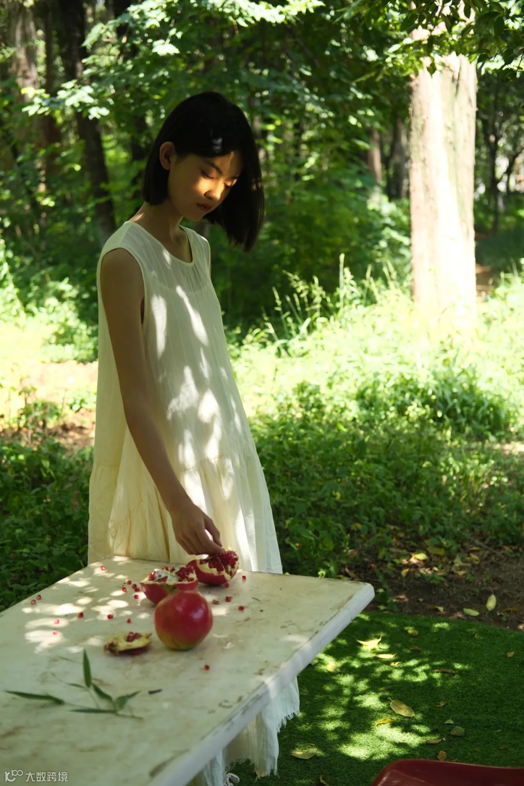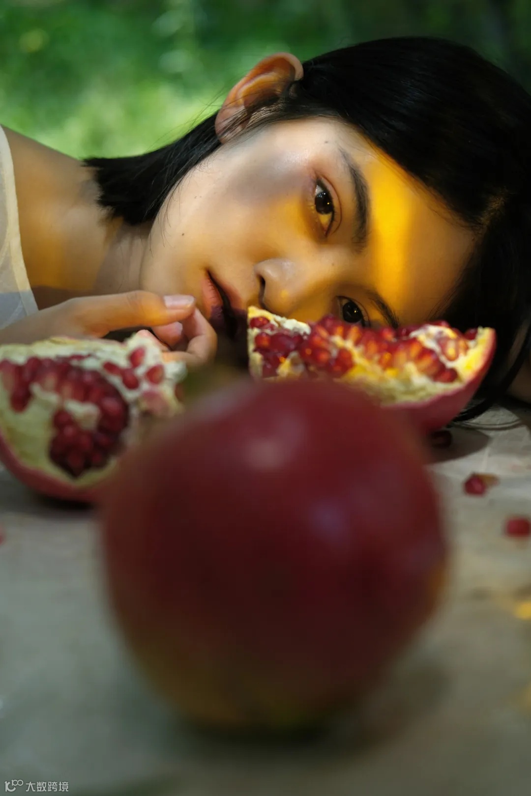 在拍摄过程中,我加入了一些有趣的道具来增添画面的生动感。首先,我在满是绿色的环境中放置了一个鲜红的石榴。这不仅体现了盛夏的清凉感,还成为了画面的视觉焦点。鲜艳的红色与周围的绿色形成强烈对比,立即吸引观者的目光。这种色彩的运用,充分展示了X-M5优秀的色彩还原能力。