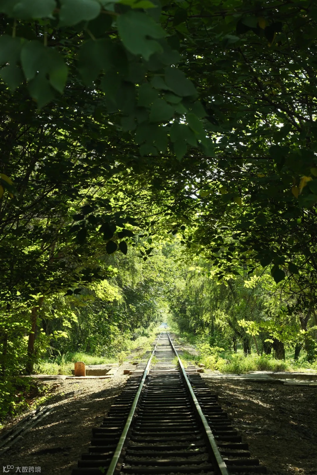 另一个令人印象深刻的场景是一段笔直的铁路。茂密的植被从两边向中间汇集,形成了一个仿佛来自动漫世界的梦幻场景。