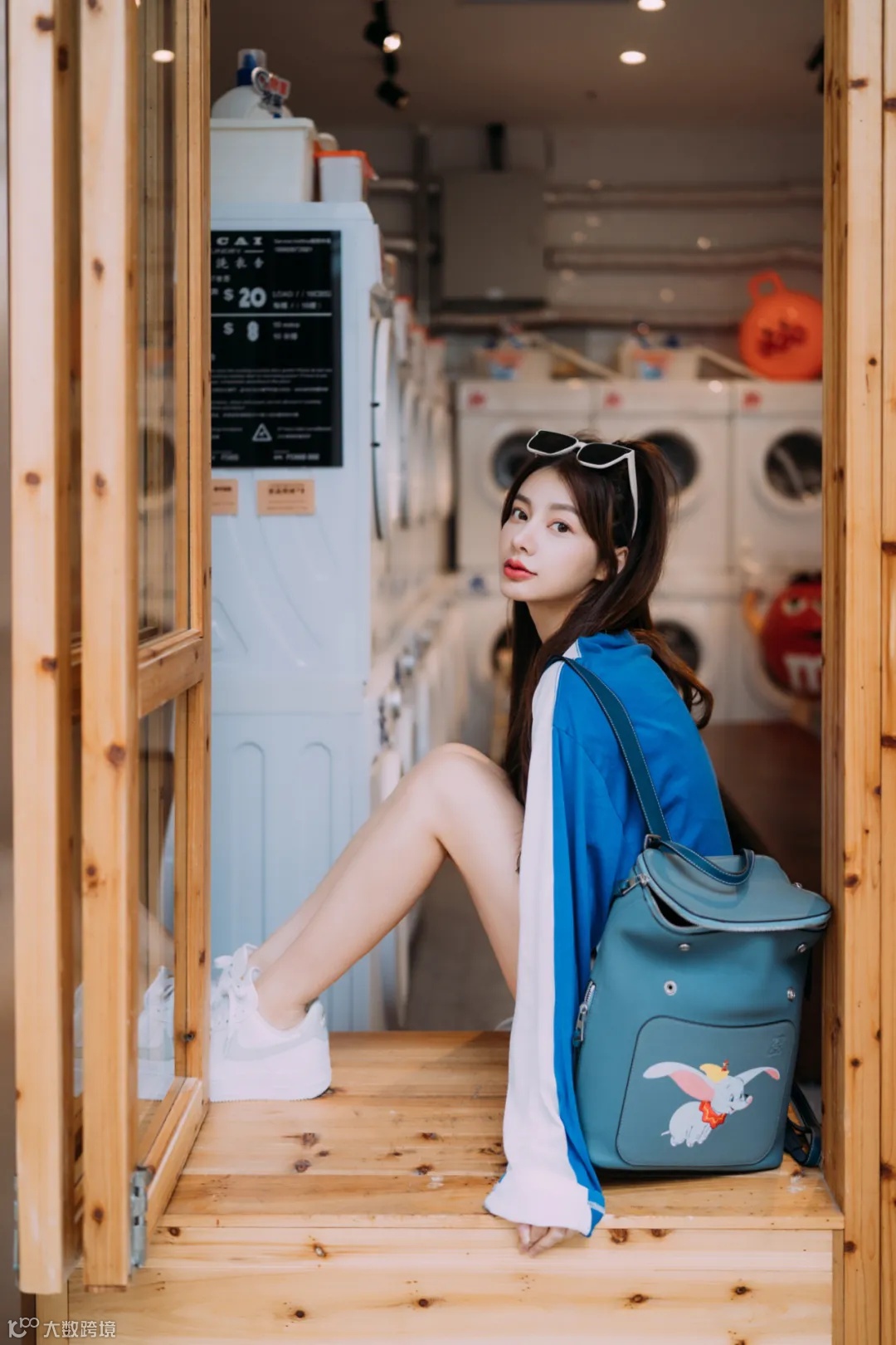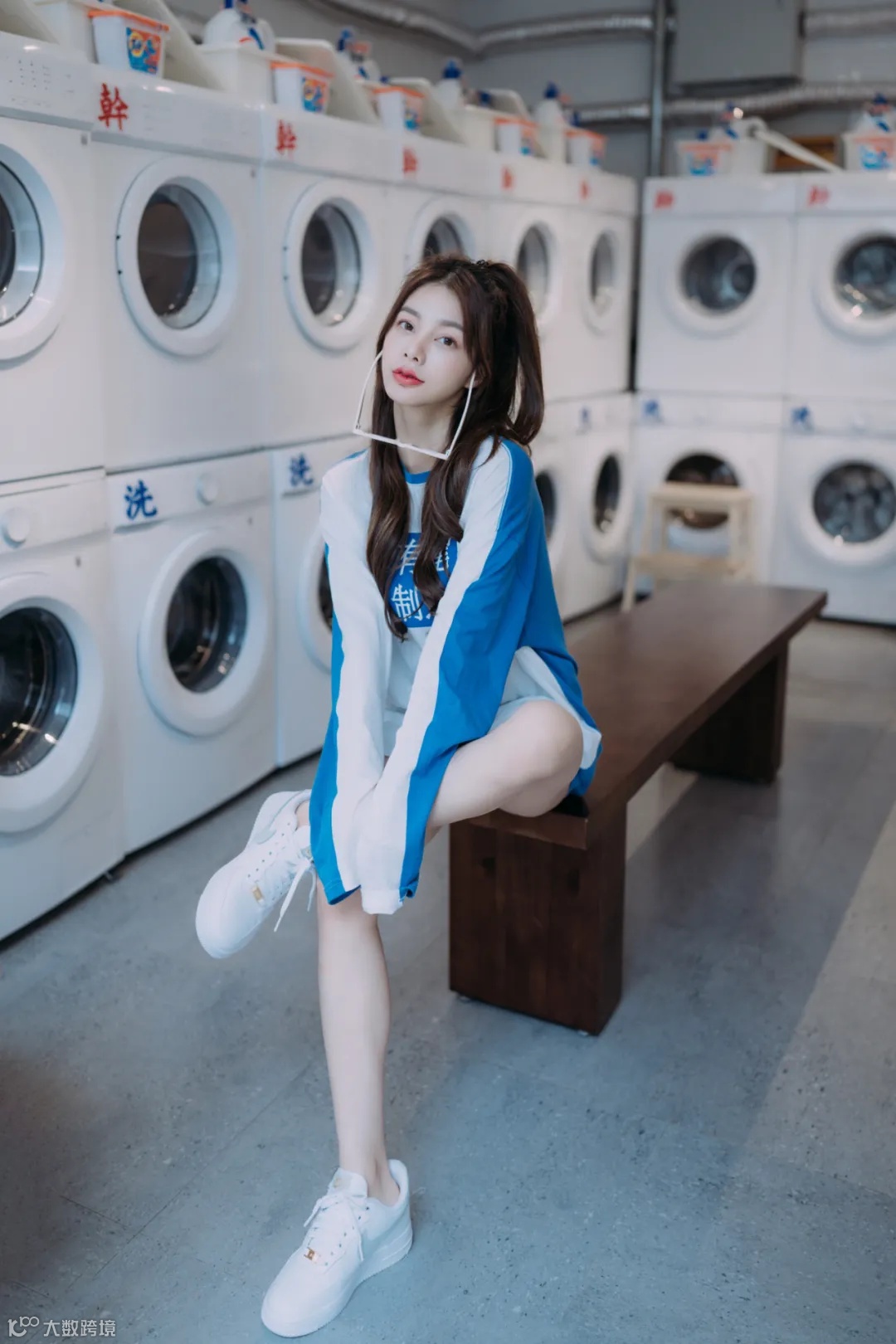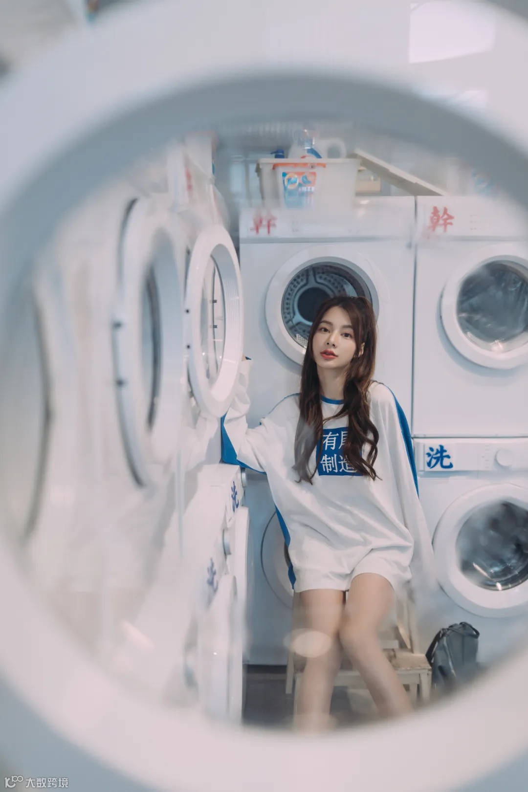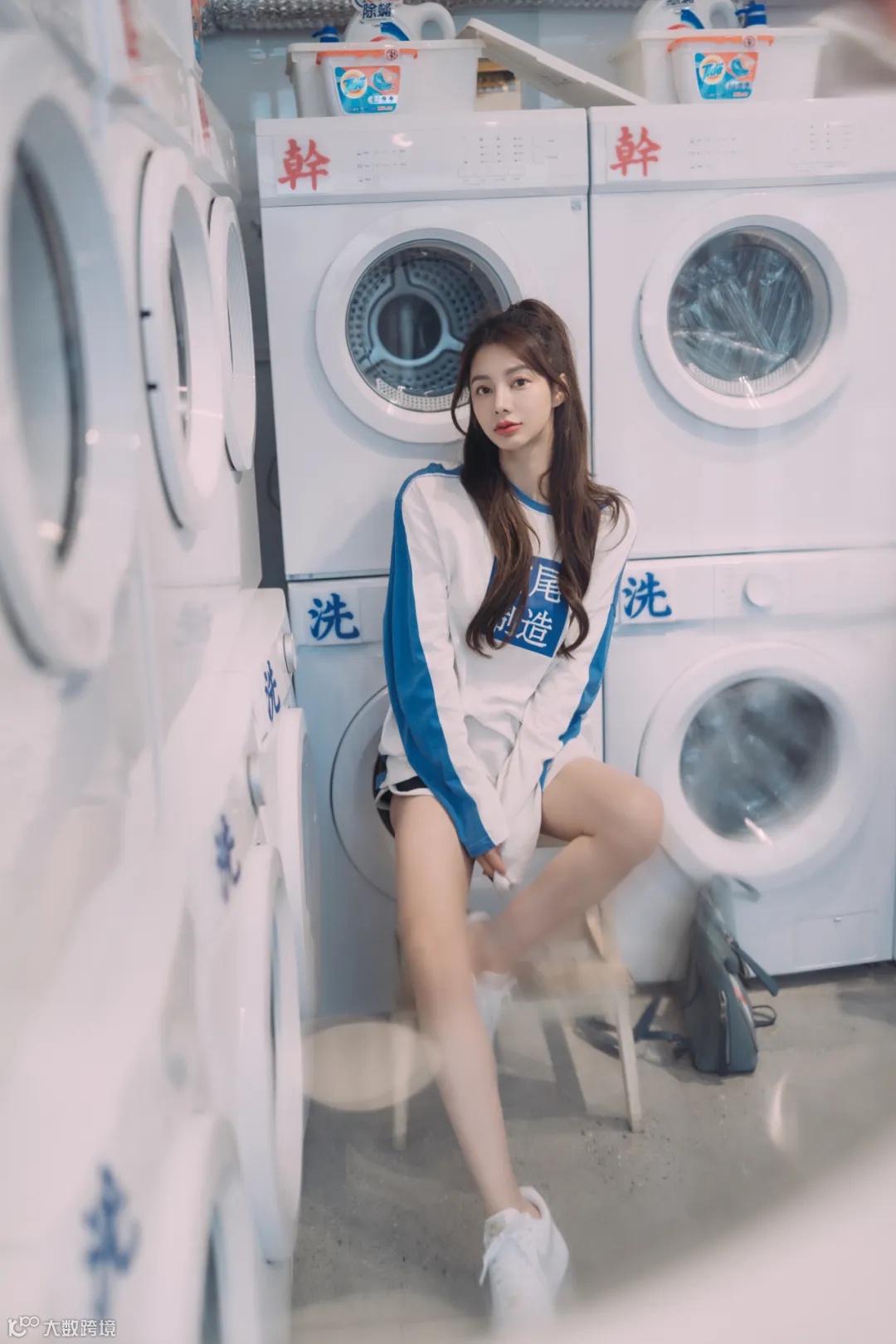 第一张照片,悬着在洗衣机的背景下,让模特靠在椅子上,腿尽量往前伸,利用FE 35mm F1.4 GM广角边缘拉伸效果,拍摄出大长腿效果。