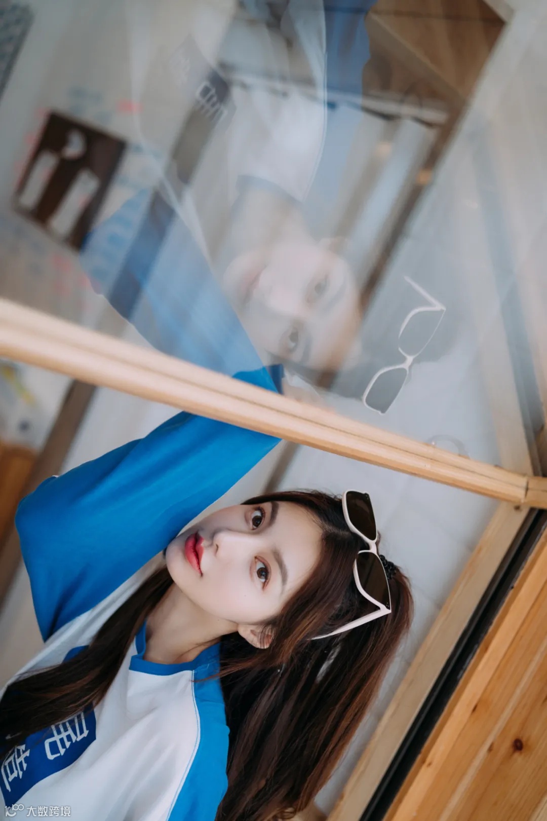 细心的小伙伴们有没有发现右侧有一扇竖开的窗户。我比较喜欢利用玻璃来拍摄,但是位于头顶的玻璃要怎么利用呢?第五张照片,我让模特站在窗户后,探出脑袋往上仰。而我在一个高机位,调整窗户角度把模特给倒影出来。将模特和倒影都带入画面,成就了本次拍摄最满意的照片。