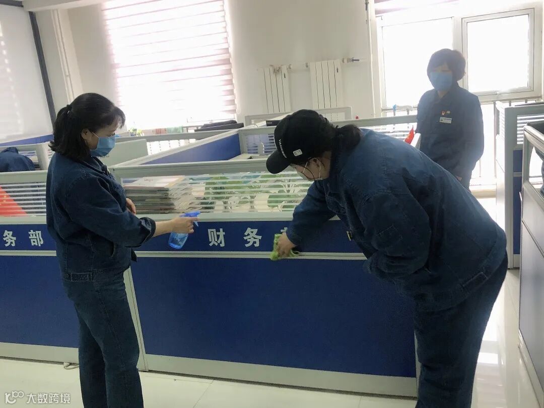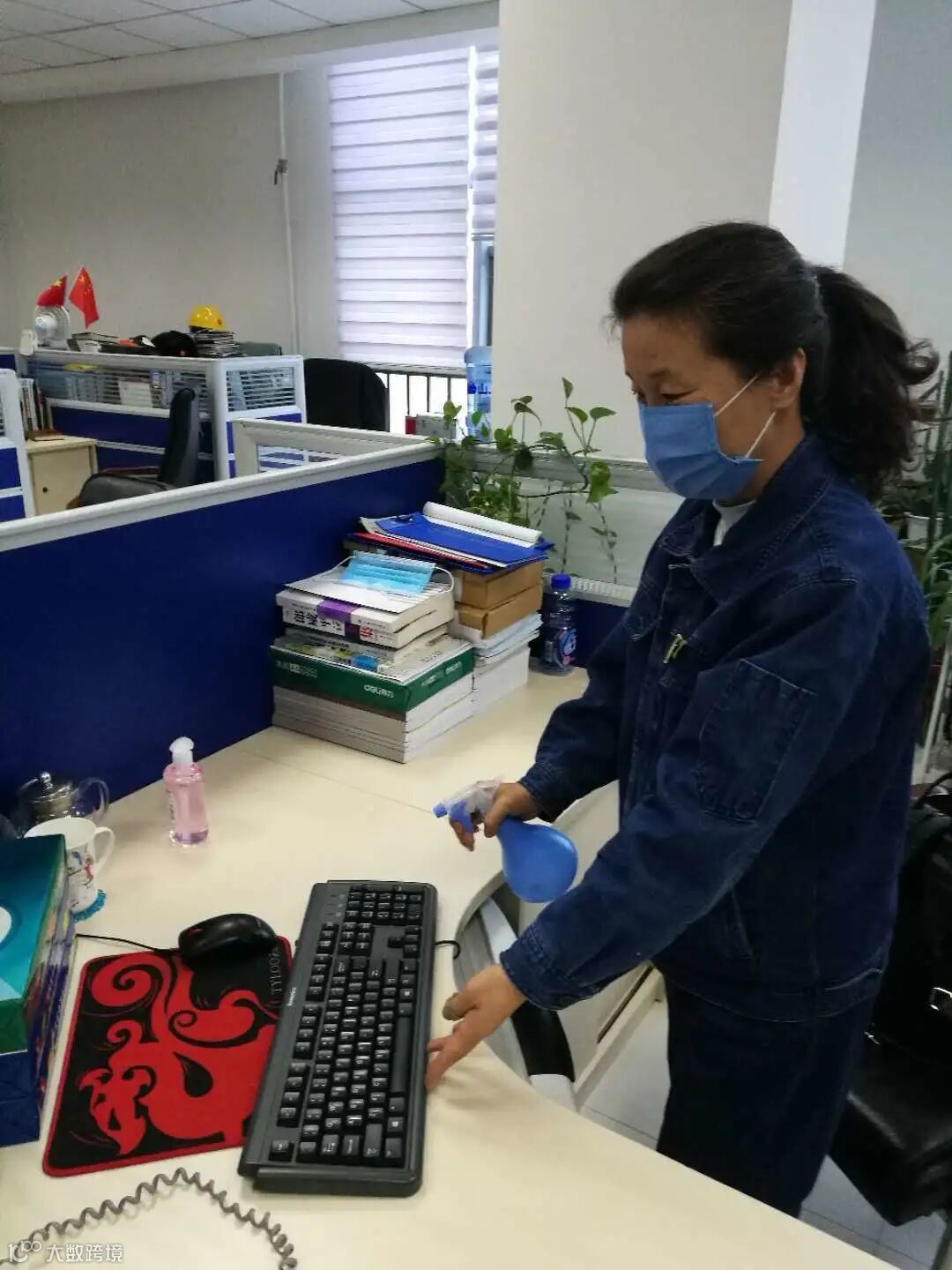 机关三分会女工在疫情期间每日做好办公区域消毒工作,为同事提供一个健康的工作环境。