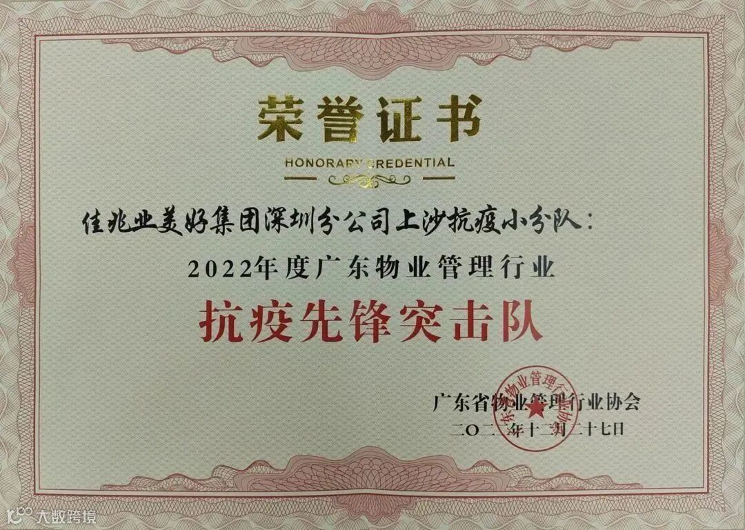 12月27日,在“弘扬抗疫精神·致敬平凡劳动者”广东省物业管理行业抗击新冠肺炎疫情表彰大会暨先进事迹报告会上,佳兆业美好深圳分公司上沙抗疫小分队与赤尾抗疫小分队分别荣获“抗疫先锋突击队”,同时,上沙抗疫小分队的李森林也获评“抗疫先锋个人”。
