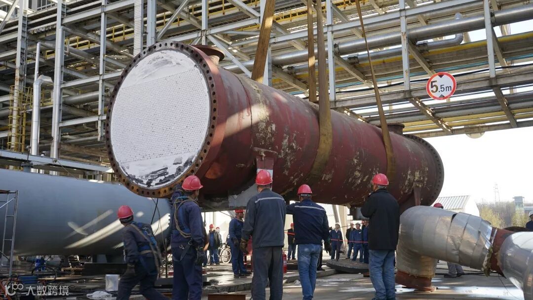 聚丙烯装置E-4002第一循环冷却器的更换任务是此次小修的“重头戏”。冷却器直径近2米,长18米,重约69吨,需要拆卸大小螺栓近200个,其中最大的螺栓重30余斤,即使最小的螺栓也重达20余斤。