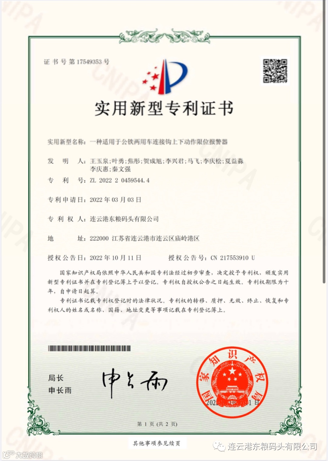 日,公司科技之家通知群发布一条好消息,年初公司申报的“一种适用于公铁两用车连接钩上下动作限位报警器”实用新型