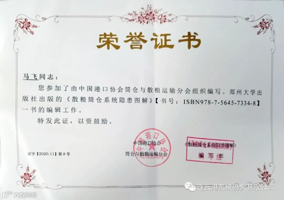 2020年11月27日上午,港口协会散粮运输分会在东莞赤湾码头有限公司召开《散粮筒仓系统隐患图解》的首发仪式,连云港东粮码头有限公司总经理叶勇做为书籍副主编、公司高级工程师马飞做为书籍编委参加了《散粮筒仓系统隐患图解》的首发仪式。