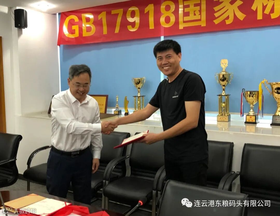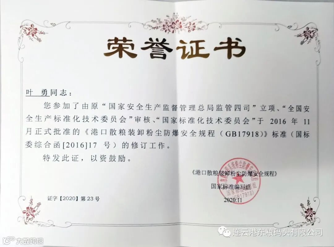 当天下午,港口协会散粮运输分会还组织全国散粮筒仓行业20名专家完成了《港口散粮装卸粉尘防保安全规程标准(GB17918)》的终审工作,此标准经国家安全生产监督管理总局监管四司立项,全国安全生产标准化技术委员会审核,提升了散粮筒仓系统的标准化程度,为筒仓的安全运行提供了有力的标准依据,同时为全国散粮筒仓系统的安全生产做出了贡献。会上港口协会筒仓与散粮运输分会会长赵朝雄授予国标修订的专家成员叶勇、马飞荣誉证书,肯定了东粮码头有限公司在散粮筒仓行业内的取得成绩。