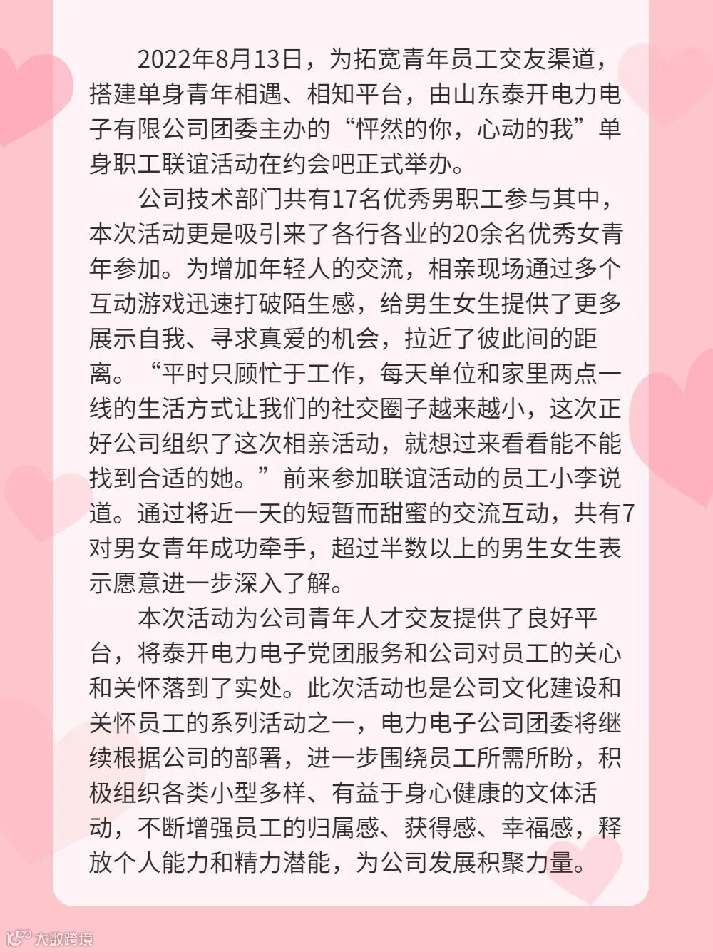 至此,联谊交友活动圆满完成,活动现场气氛轻松又热烈,男女青年或收获浪漫爱情,或收获真挚友谊,大家纷纷表示喜欢这样的青春快乐的氛围,相遇即美好,青春不散场!