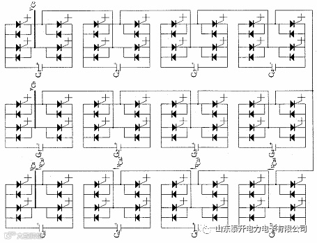 总的电压输出和整个装置的容量可以成倍提高;可以对串联的每个桥采用不同的驱动脉冲,使每个桥输出电压所含谐波大小和相位不同,使最终叠加的总输出电压谐波含量很小;链式结构可以模块化,而且在设计时便于采用冗余设计,串连桥链中某一个损坏可以被旁路,不影响整个桥链的工作,便于容量扩展;链式结构三相相互独立,在系统不平衡时其可通过三相独立控制,正常投入运行,更好的提供电压支撑;链式结构不足:三相独立且每个单相桥直流侧分隔,装置在工作时,直流侧电压波动较大,因而直流侧需要安装容量较大的电容器,同时串联的单相桥直流侧电压可能不平衡,因此需平衡直流侧电容,否则影响装置安全。