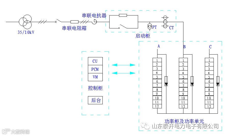 SVG组成部分主要为串联电阻箱、串联电抗器、启动柜、功率柜、控制屏。三相逆变功率单元为星接。
