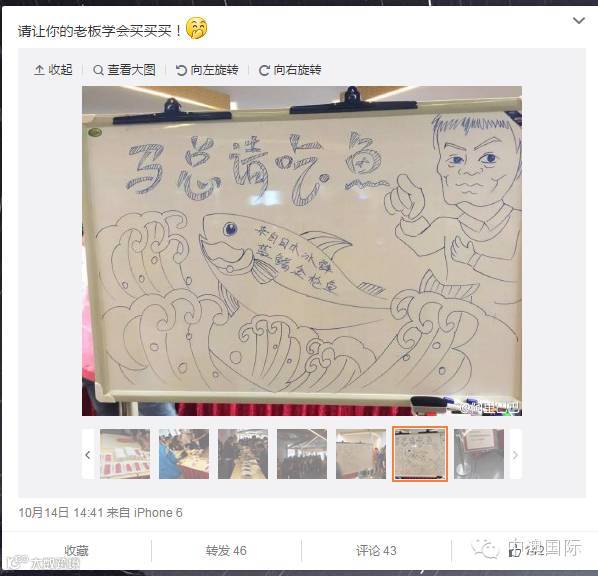 10月13日,马云花38888元在天猫买了一条鱼。任性的马云在看了一眼这条鱼后,觉得自己很喜欢,立即掏出手机放进了购物车迅速结账。网友评价,这才是剁手族们正确打开淘宝的“姿势”。