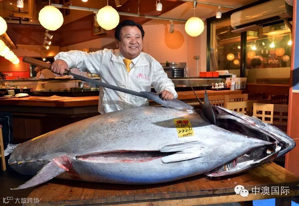 据天猫的小二们说,这条鱼名叫蓝鳍金枪鱼,产自太平洋和大西洋海域,被誉为“金枪鱼之王”。不过本次展出的蓝鳍金枪鱼,是天猫商家在日本长崎海域养殖的蓝鳍金枪鱼。这一条重达68公斤,是在24小时内远洋捕捞并从日本冰鲜直送过来。这鱼是长这样的