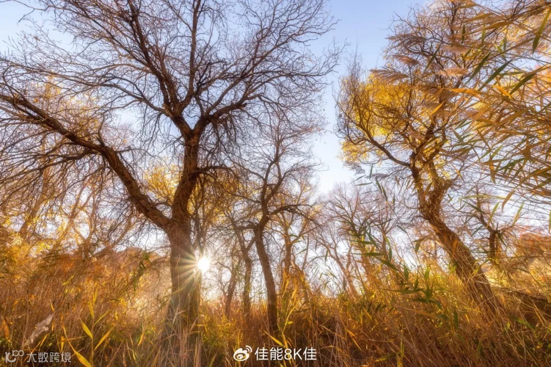 秋季,是胡杨一年中最绚烂的季节。那成片的胡杨像是被大自然用金色的颜料精心涂抹过一般,展现出格外绚丽的色彩。金灿灿的色调如同一团燃烧的火焰,从每一片树叶间蔓延开来,渲染了这片广袤的胡杨林。为了留住这惊艳的美景,我选择用广角拍摄,进行了多张曝光。适当地收缩光圈,阳光穿过树叶的缝隙,竟产生了绚丽无比的星芒。那一道道星芒如同璀璨的光箭,从胡杨林中散射而出,让每一棵树都披上了梦幻的纱衣。