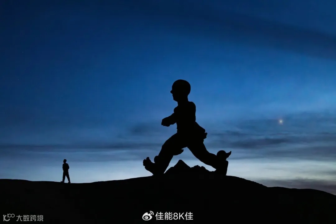 蓝调时刻我们路过瓜州雕塑长廊发现了这个向前行走的小孩,同行的小伙伴在上面来回行走,我赶忙拿起相机进行连拍,终于得到这张人物、建筑和火星同框的画面。佳能EOS R5优秀的防抖让拍摄更加便捷,画面中金星在右侧格外的明显,让整个画面更加协调。