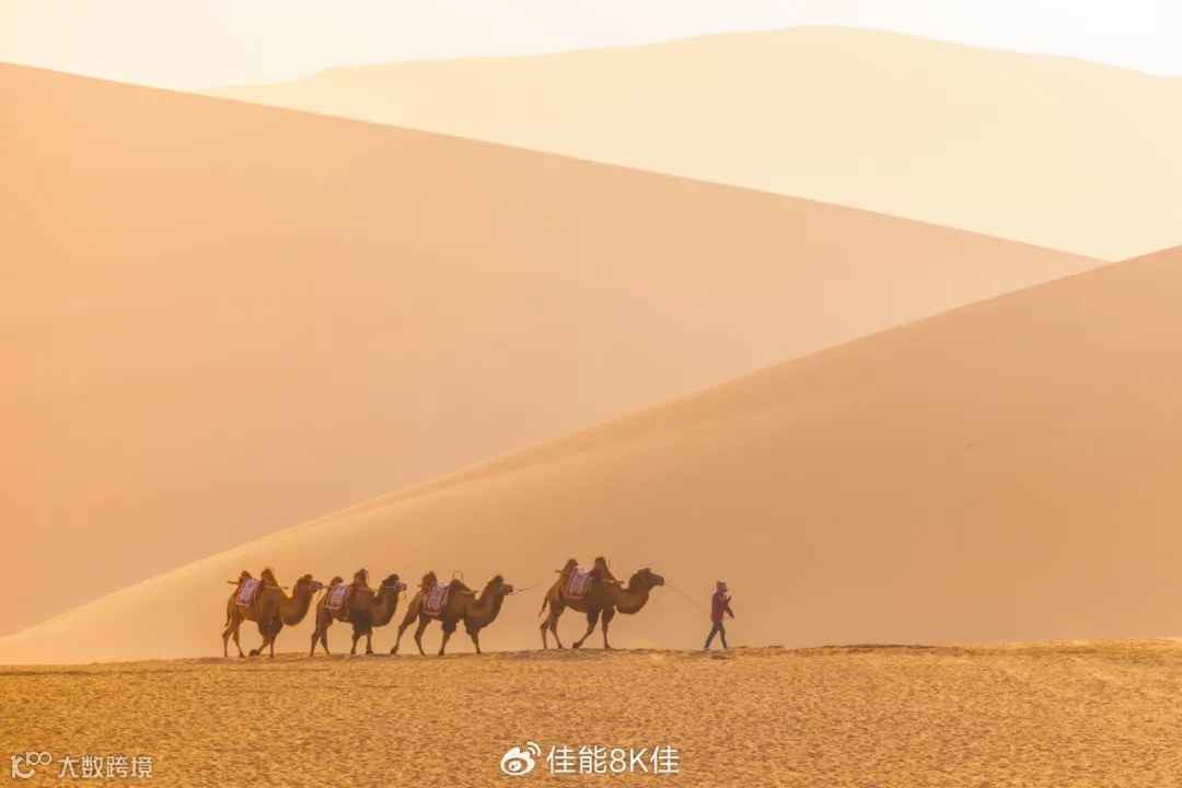 镜头下是驼队缓缓走过沙漠的场景。驼队的身影在金色沙浪中起伏,一步一个印,它们是这片金色沙漠中的行者。驼队与沙漠的呼应是鸣沙山金色画卷中最生动的笔触,书写着沙漠中永恒的故事,为这金秋的美景增添了一抹别样的风情。