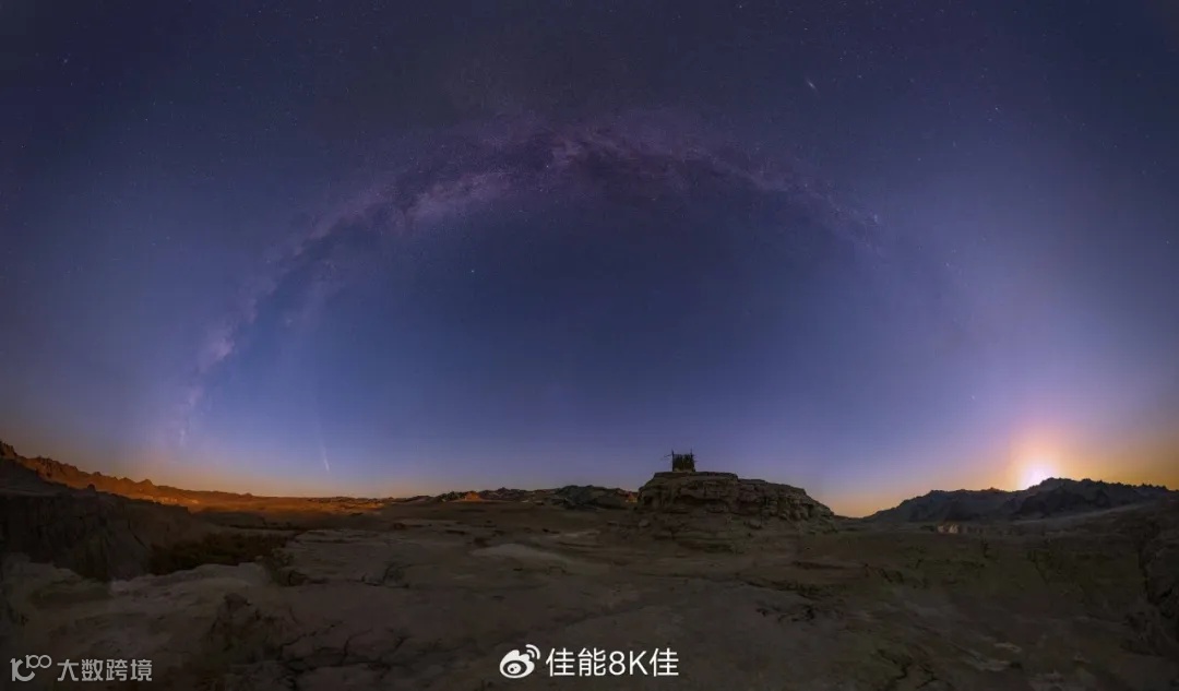 我兴奋不已,采用多张拼接的方法,将整个天空中壮丽的银河纳入同一个画面。在银河的光辉下,远处的紫金山阿特拉斯彗星也清晰可辨,它拖着长长的尾巴,就像一位神秘的访客,为这浩瀚星空增添了一抹独特的色彩。不久之后,远处的月光如银色的绸缎般从地平线上缓缓铺开,柔和的月光洒在峡谷、雅丹,洒在这片广袤的土地上,与璀璨的星空相互交织。此刻,眼前的画面如同被神来之笔绘就的一幅绚丽巨画,仿佛时间都为这绝世美景而停滞。
