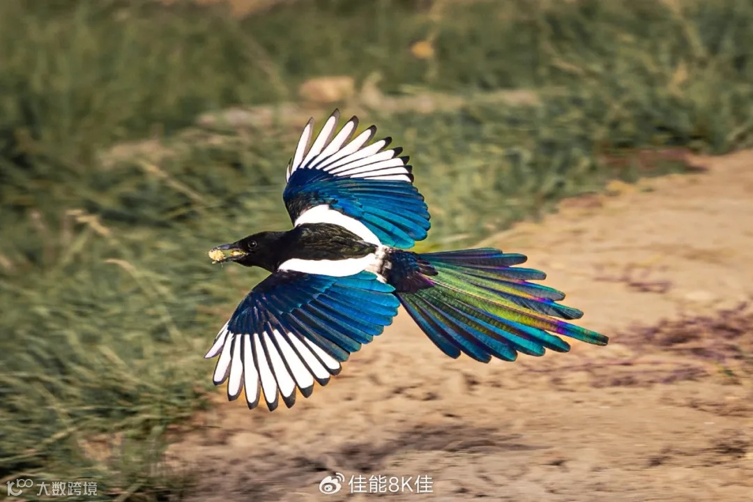 我心生好奇,赶忙拿起相机,连拍了多张。这时我才发现,它小巧的嘴里竟叼着泥土,看来是在修筑自己的小窝。这只喜鹊就像一个专注的艺术家,精心雕琢着自己的家园。它飞起来的瞬间,五彩斑斓的翅膀在阳光的映照下闪耀着彩色光芒,如同凤凰展翅翱翔于天际。它滑翔在这片绿意盎然的草坪上,每一次振翅都带着优雅与力量。