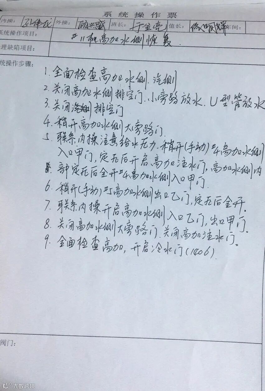 在高加装置启停操作过程中,岗位人员认真手写操作票。操作过程中,内操与外操岗位严格按照操作票内容步步确认,虽然频繁操作,但岗位人员从未发生过误操作或操作漏项等情况。