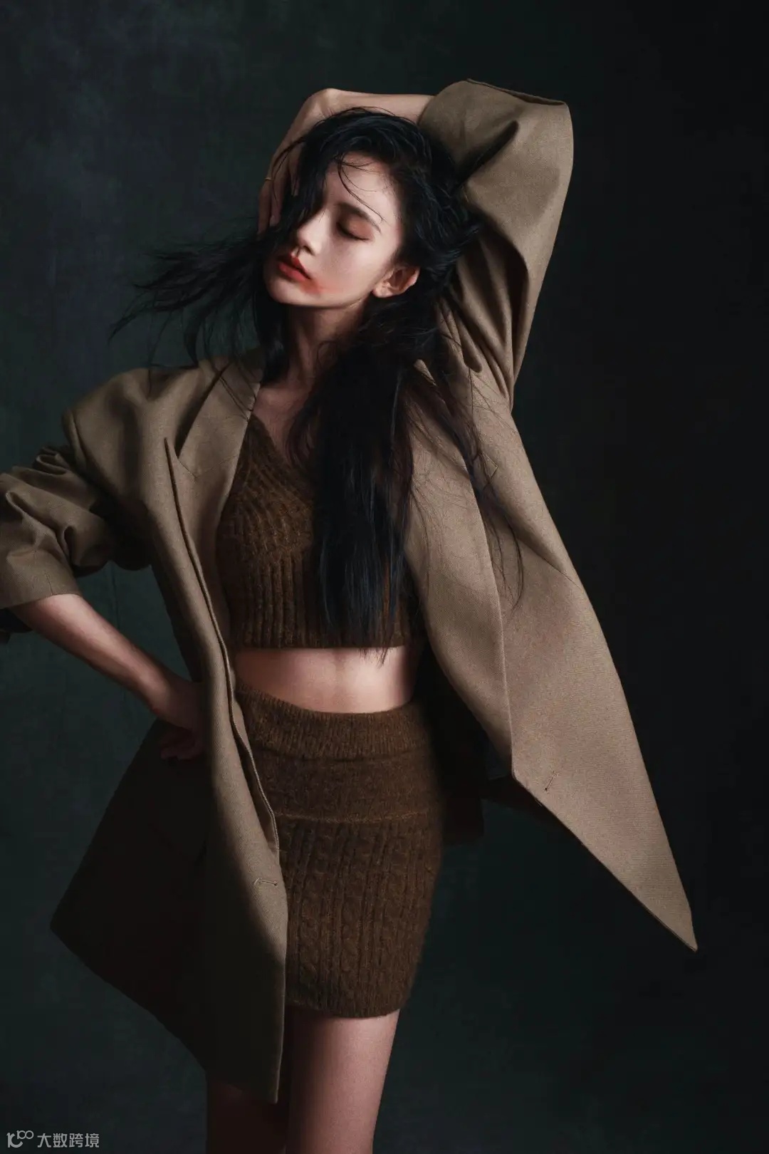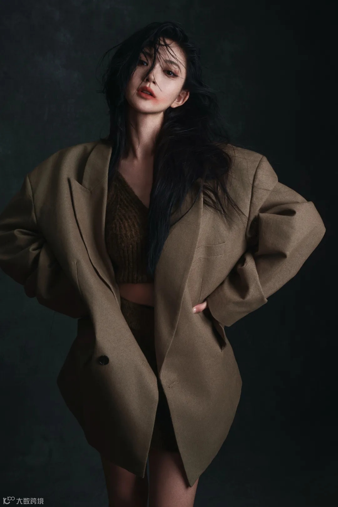 在模特的服装上,选择咖色西装及更深咖色的针织内搭,在视觉上突出色彩层次。背景选择的是油画布,能看到斑驳的磨砂材质,更具野性。