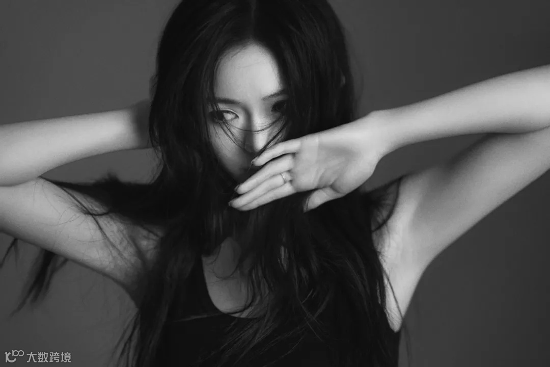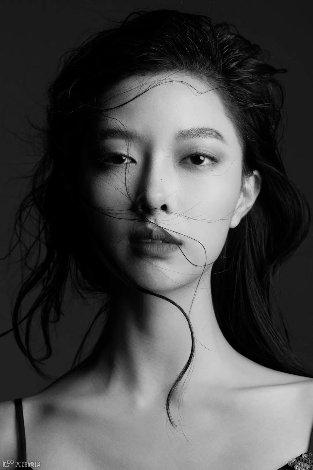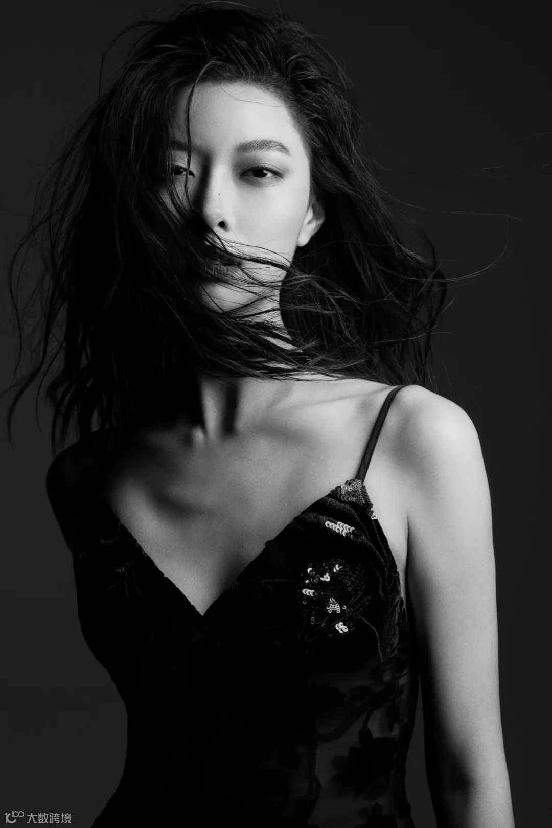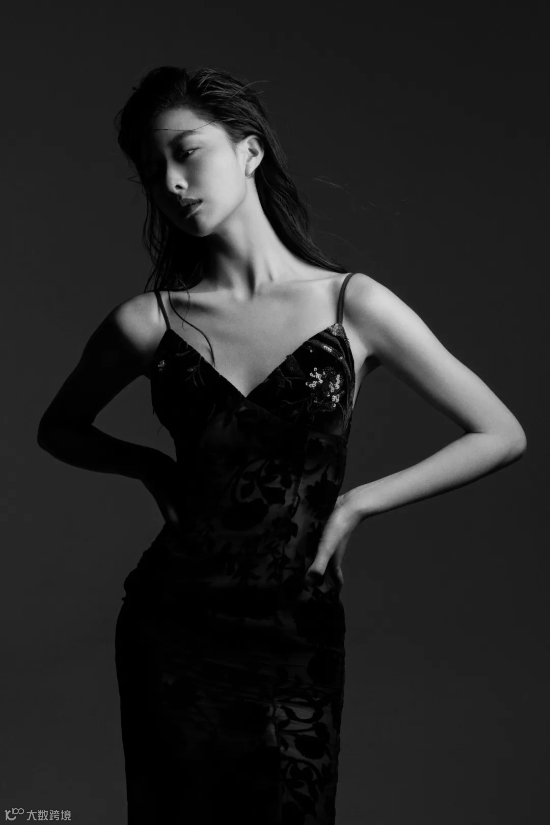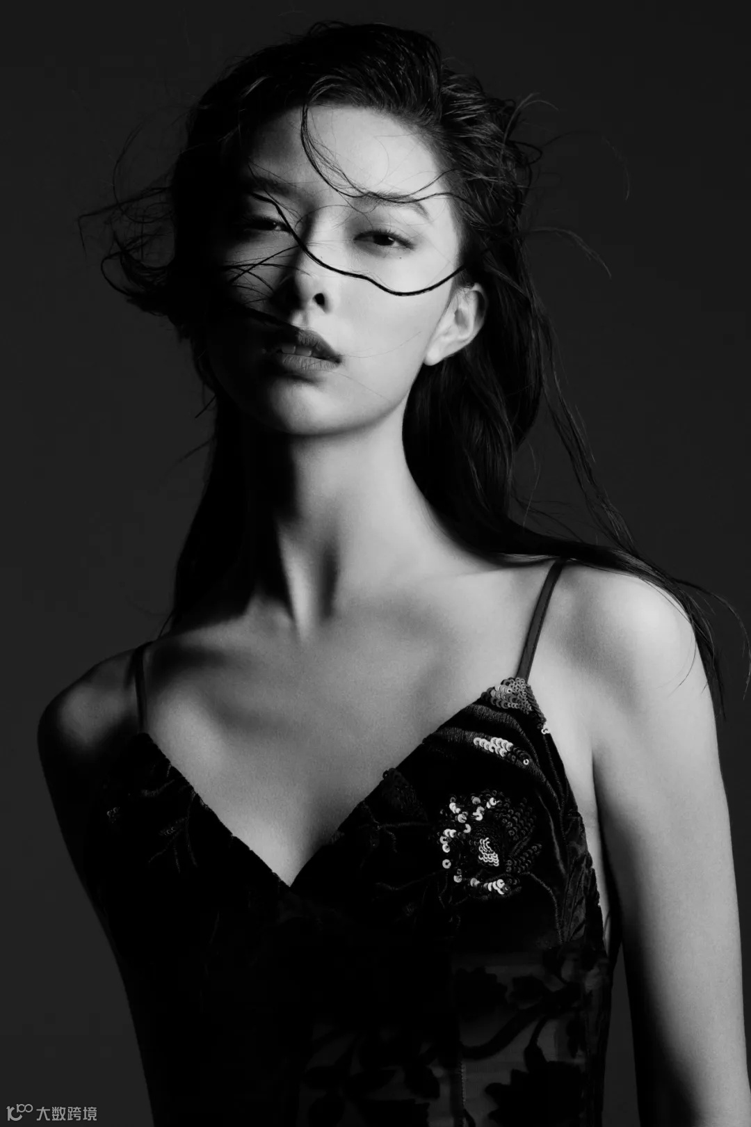 在创作这组黑白大片时,我选择用1200w闪光灯,在侧上方大约30°的位置进行打光,使画面的明暗对比更加强烈,勾勒出模特优越的身形及肩颈线条。