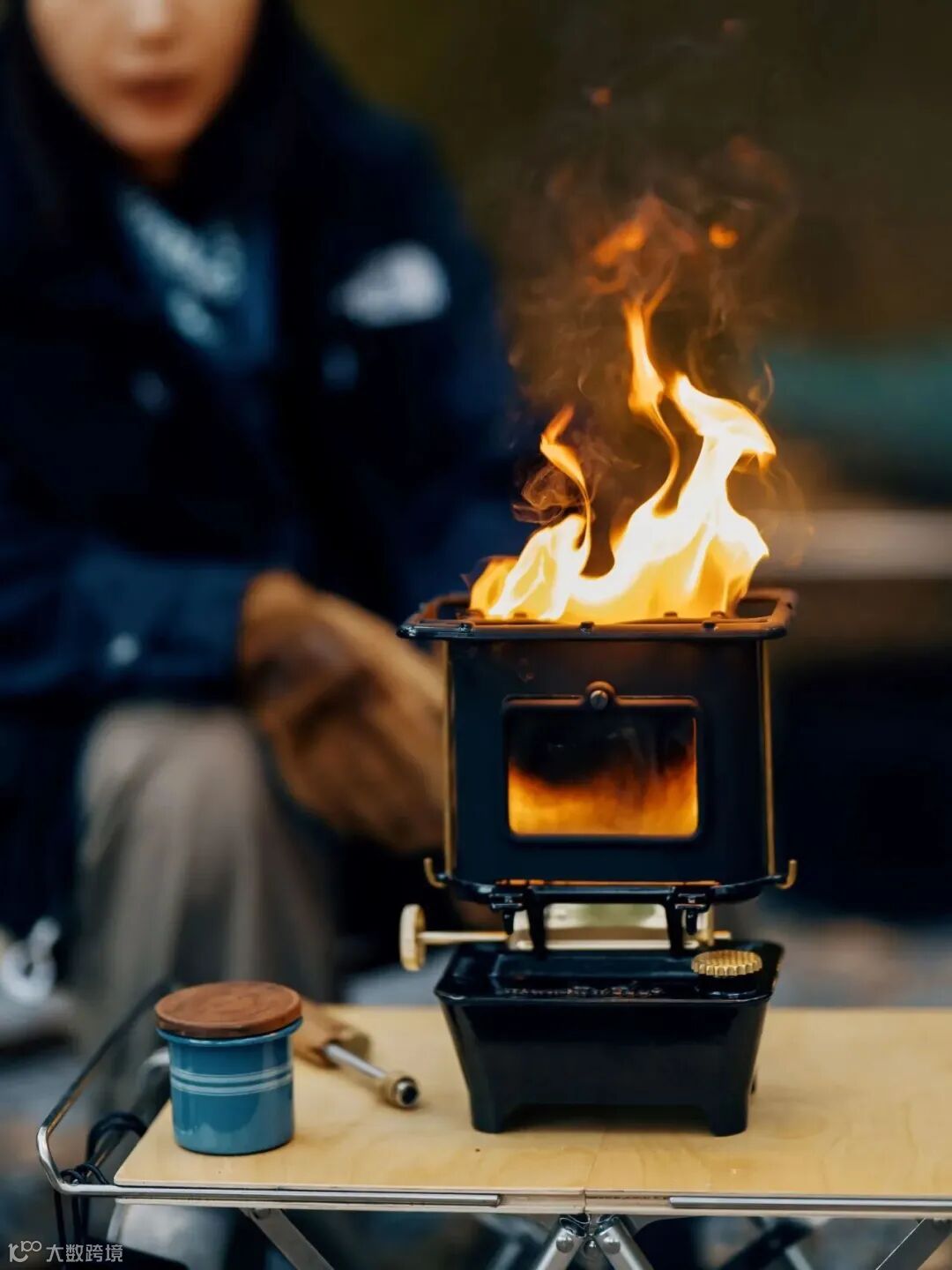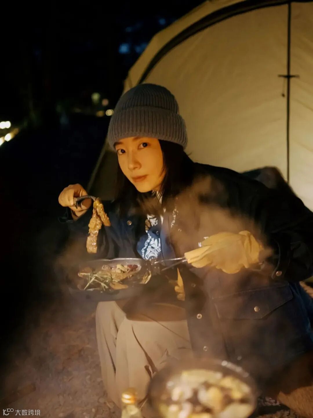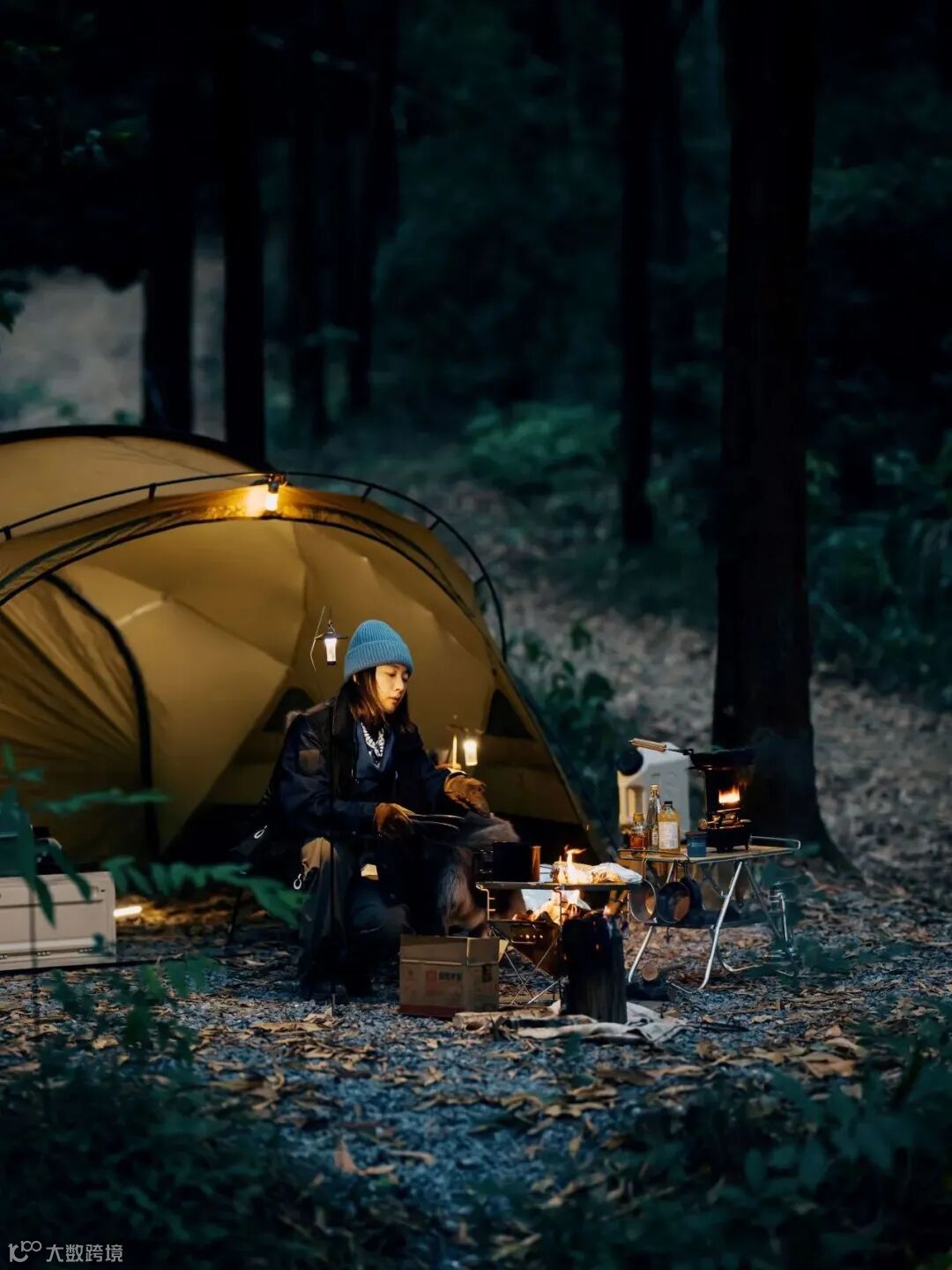 为了在暗光下兼顾环境氛围感和人脸的亮度,我通常会将篝火放置于人物面前用于补光。但是注意,篝火作为光源其位置低,容易形成低射角光线,面部的光影并不适合拍摄。此时,可以让人坐下或者蹲下,也可以再设置一个高于人脸位置的露营灯作为第二处补光,通常会营造出不错的现场氛围感。
