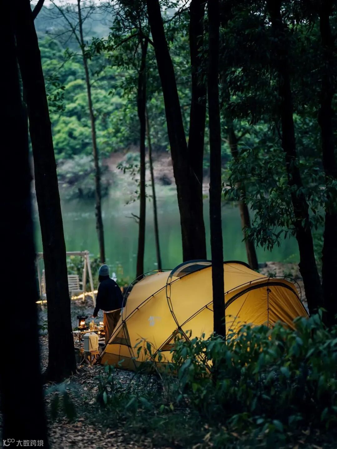 到达营地后,我会根据拍照所需的机位角度和光线情况,考虑帐篷搭建的方位并布置其他细节。这次的露营地是湖边的一片树林,环境非常舒适,但树干和树枝线条较多。为了保证画面的整洁,我所使用的都是大光圈定焦镜头,中长焦段结合大光圈带来的大幅度虚化效果,可以有效避免背景杂乱。