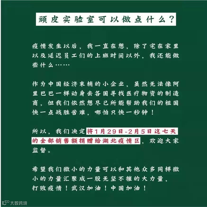 今年1月份,新型冠状病毒感染肺炎疫情爆发,夫妻俩积极响应国家号召,延迟复工。“除了在家呆着,咱俩还能为疫情做点什么呢?”“咱俩捐点款吧!”1月28日清晨点击进入顽皮实验室淘宝店首页的粉丝就看到这样一条温情公示:为了抗击疫情,顽皮实验室决定将1月29日——2月5日共8天的销售总额捐赠给武汉疫情区!谢谢各位北鼻的支持,这笔捐款中也有你们的一份力量!”