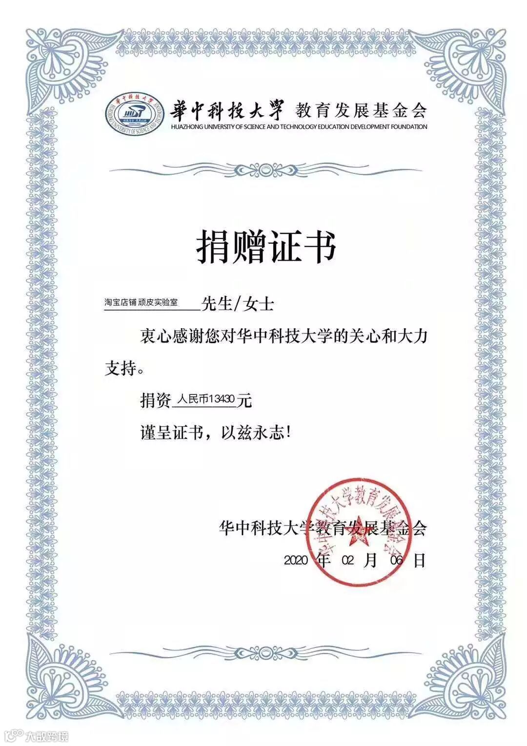“淘宝店铺顽皮实验室:衷心感谢您对华中科技大学的关心和大力支持。捐资13430元。谨呈证书,以兹永志!”面对眼前这份华中科技大学教育发展基金会捐赠证书,抚顺石化公司石油三厂调研员张守军意识到,儿子长大成熟了,也让自己钦佩。