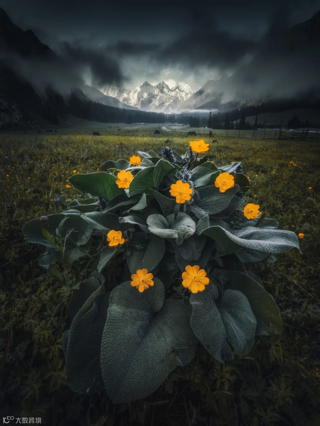 这张作品拍摄新疆昭苏县夏塔古道,拍摄前一天这里下了一整晚大雨,第二天清晨我们起了个大早,整个雪山下峡谷里平流雾弥漫。当到达雪山下的这片草原时,选好了一丛黄花作为前景,远处遮住雪山的云雾也慢慢散开。