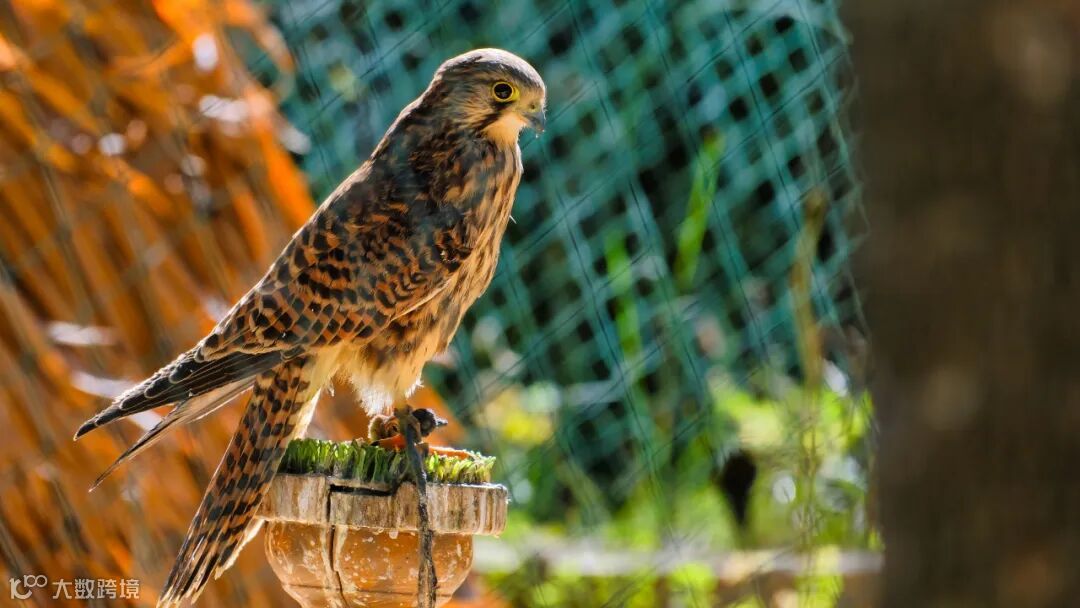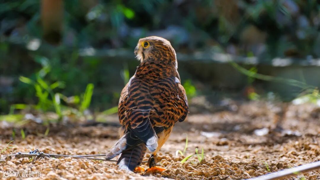 猛禽脚上的牵引绳是为了防止其应激反应乱扑腾带上的,带出来的时候牵引绳会绑在手套上,做后续的野化训练,因为人工环境下鸟类胸肌不饱满,飞行能力很差,初期训练过程中会有很多突发状况,飞行绳子是为了保护它们不会在飞行中误伤,也防止野生鸟类来驱赶训练对象发生意外。