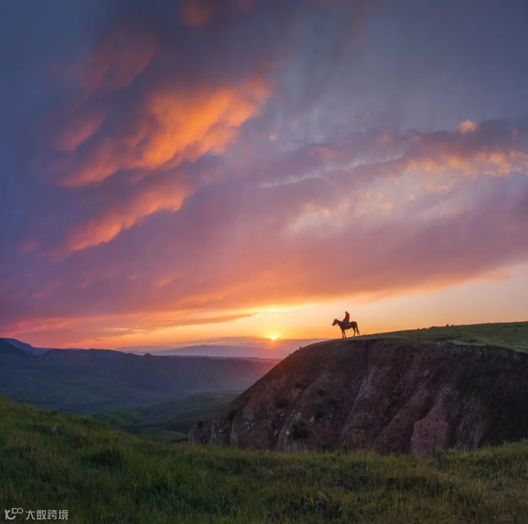 这张作品拍摄新疆特克斯琼库石台,拍摄当天下了一天雨,在临近日落的时候,天空放晴了。我们一行人驱车追着日落的方向,最后在一片草原的边缘上看到一位牧羊人在赶着自家的马和羊群,所有才有这张作品。