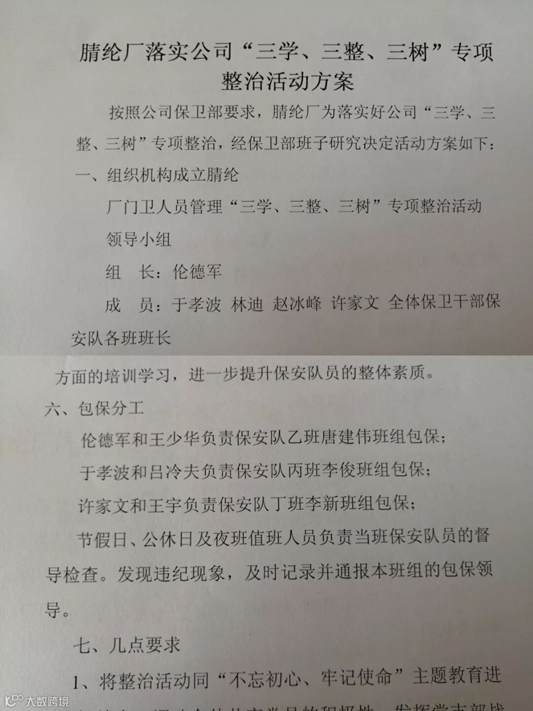 腈纶厂保卫部按照公司要求,全体保卫干警、保安队员行动迅速,全面落实公司保卫系统“三学、三整、三树”专项整治工作,即学习规章制度、学习岗位职责、学习工作流程,整顿思想作风、整顿工作纪律、整顿劳动纪律,树立新形象、树立新面貌、树立新作风。
