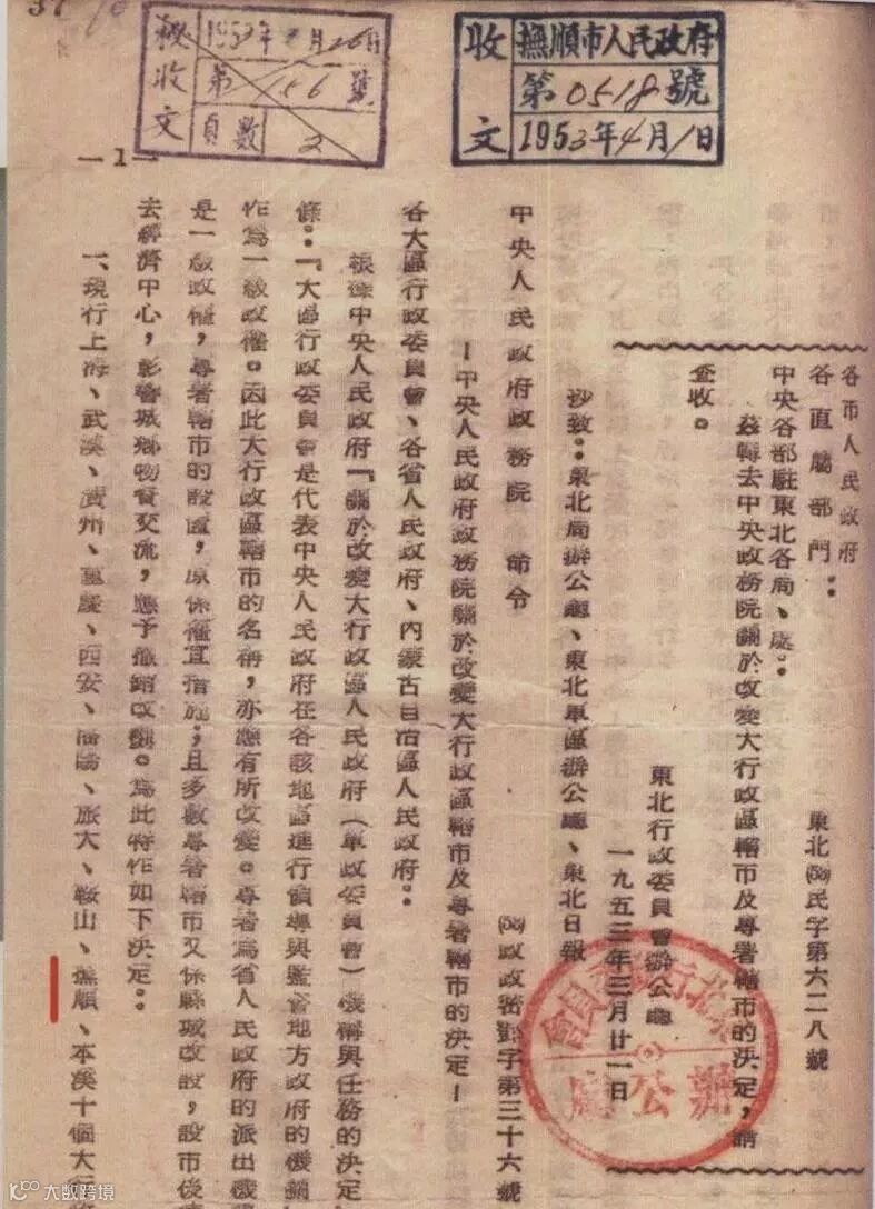 1953年3月21日,经中央人民政府政务院批准,抚顺市等十大行政区辖市改为中央直辖市。