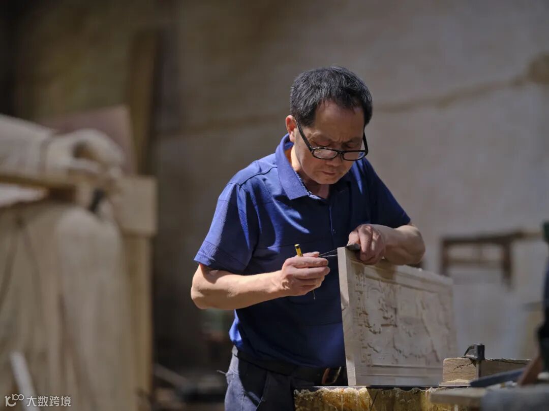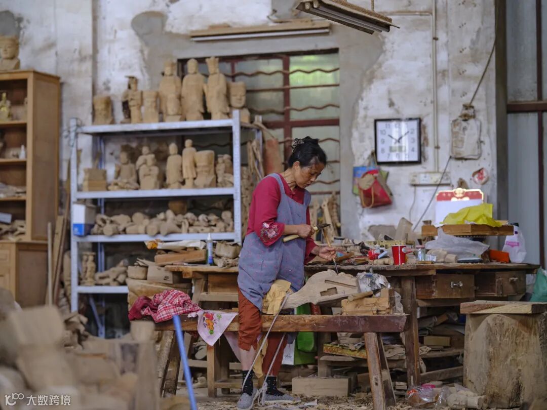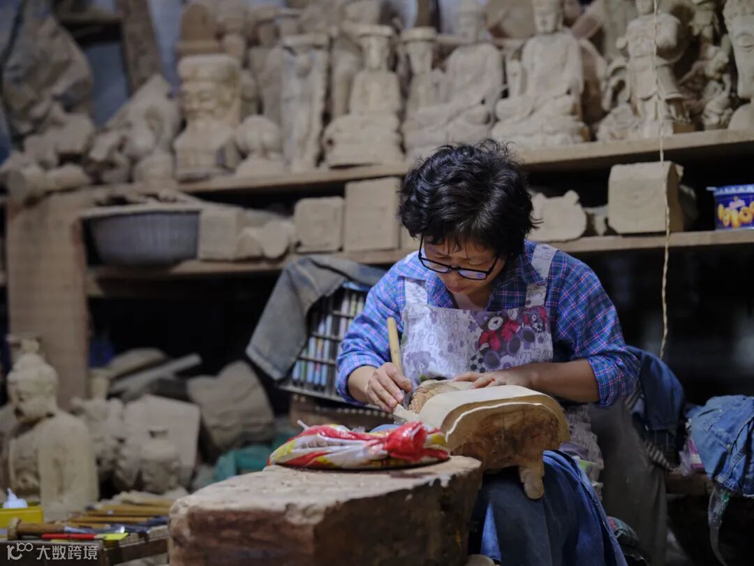 第一张图师傅正在凝视制作中的佛雕,第二张图是专攻精细花纹雕刻的女性师傅。