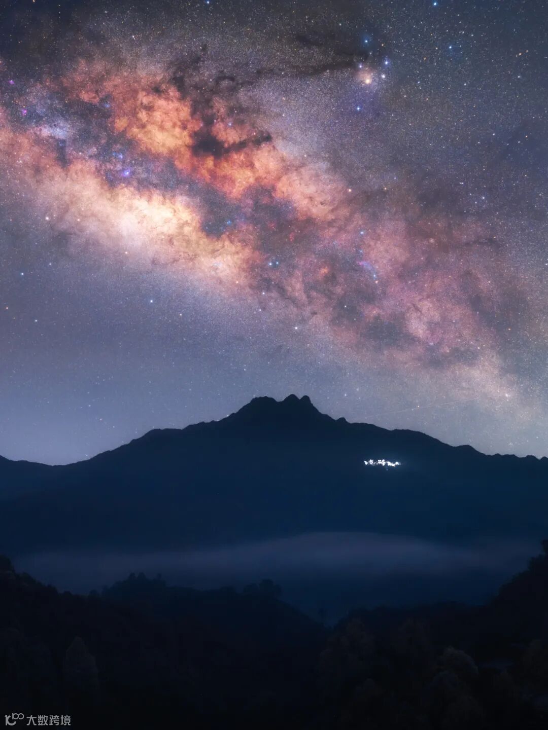 这是位于河池都安县的菁盛乡,在一座大山的山腰上拍摄的,机位的正中央刚好是竖直的夏季银河。当天拍摄的时候已经临近清晨,天边已经有少许的天光出现了。可惜的是在前面一段时间山脚下还有一层云雾环绕,但是天上也是非常多的云,等到天上云飘走了,山脚下的云雾也散了,不然拍出的照片也可以更梦幻一些。